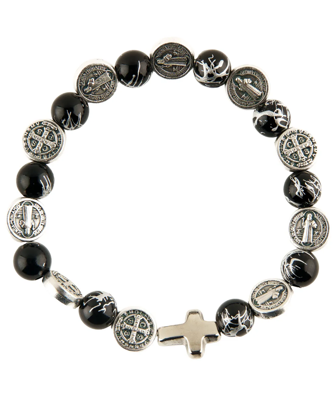Růženec desátek jako náramek se stříbrnými medailemi sv. otce Benedikta.