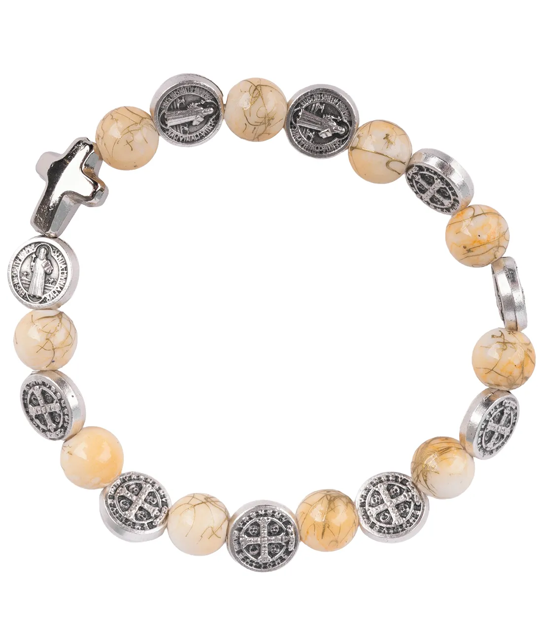Růženec desátek jako náramek se stříbrnými medailemi sv. otce Benedikta a s korálky pískové barvy s žíháním.