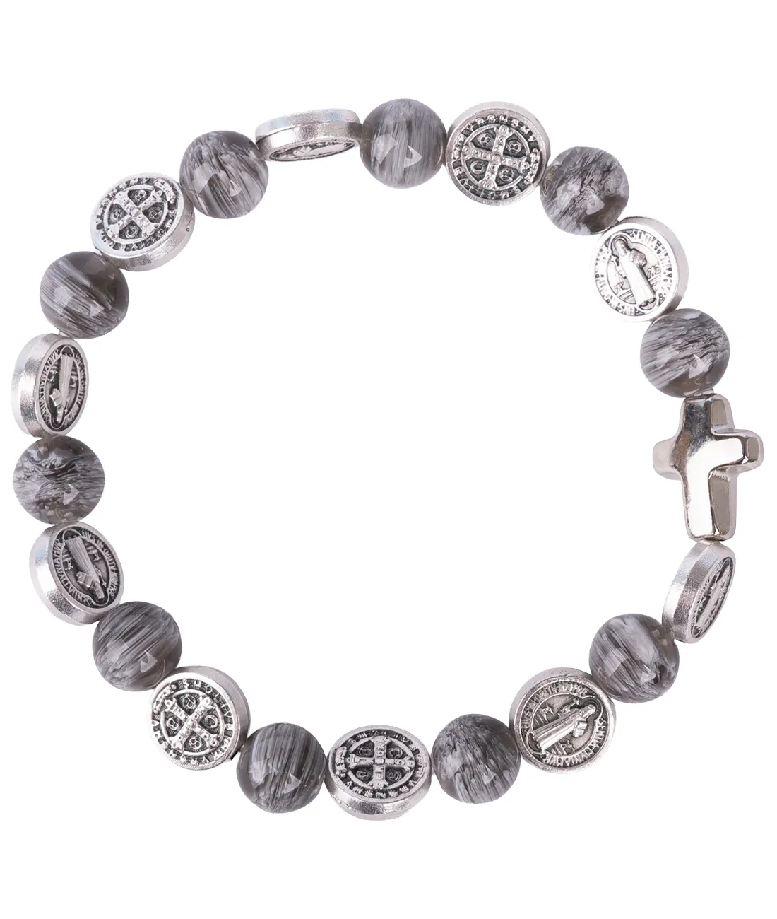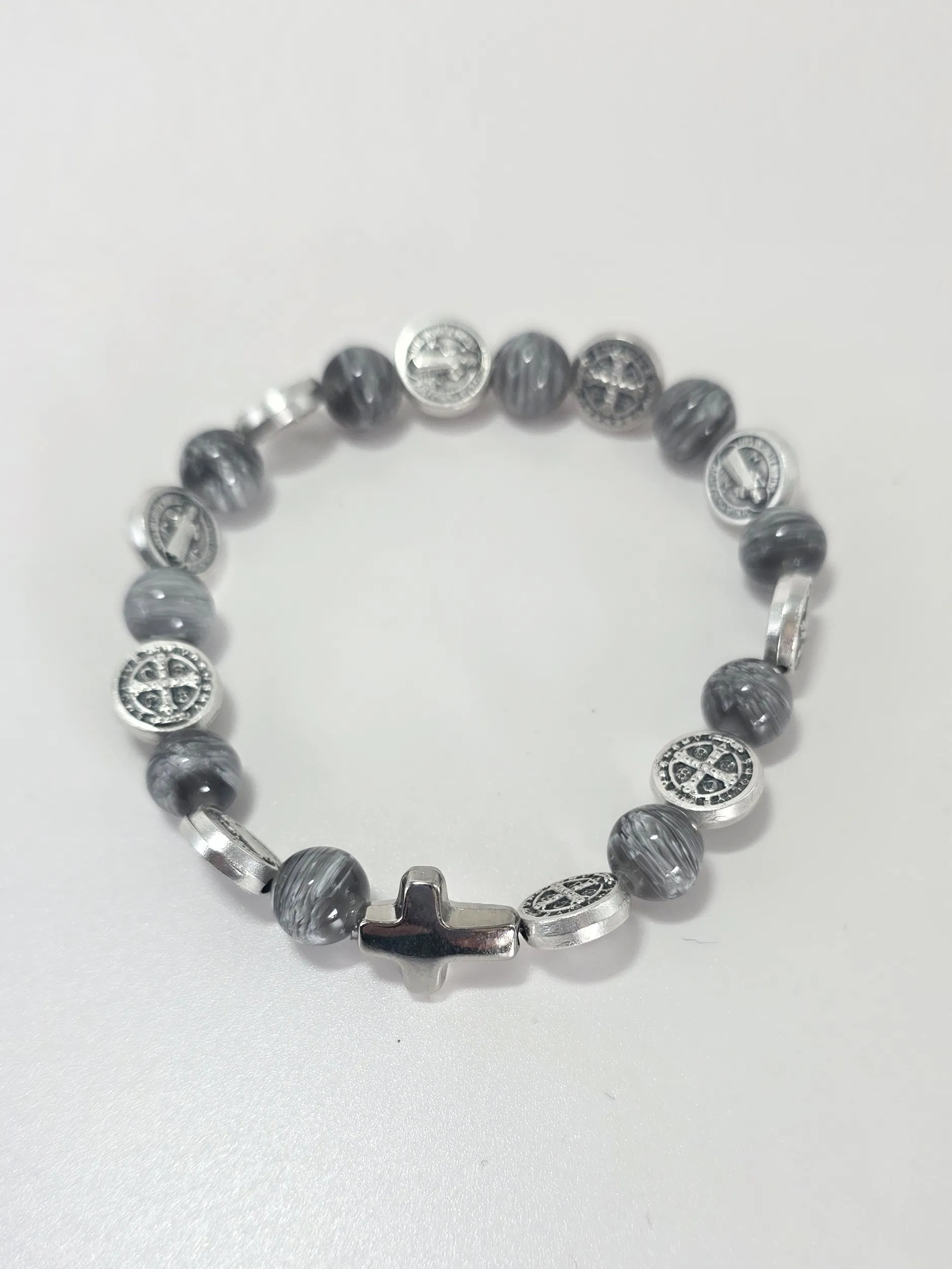 Růženec desátek jako náramek se stříbrnými medailemi sv. otce Benedikta a s šedivými žíhanými korálky.