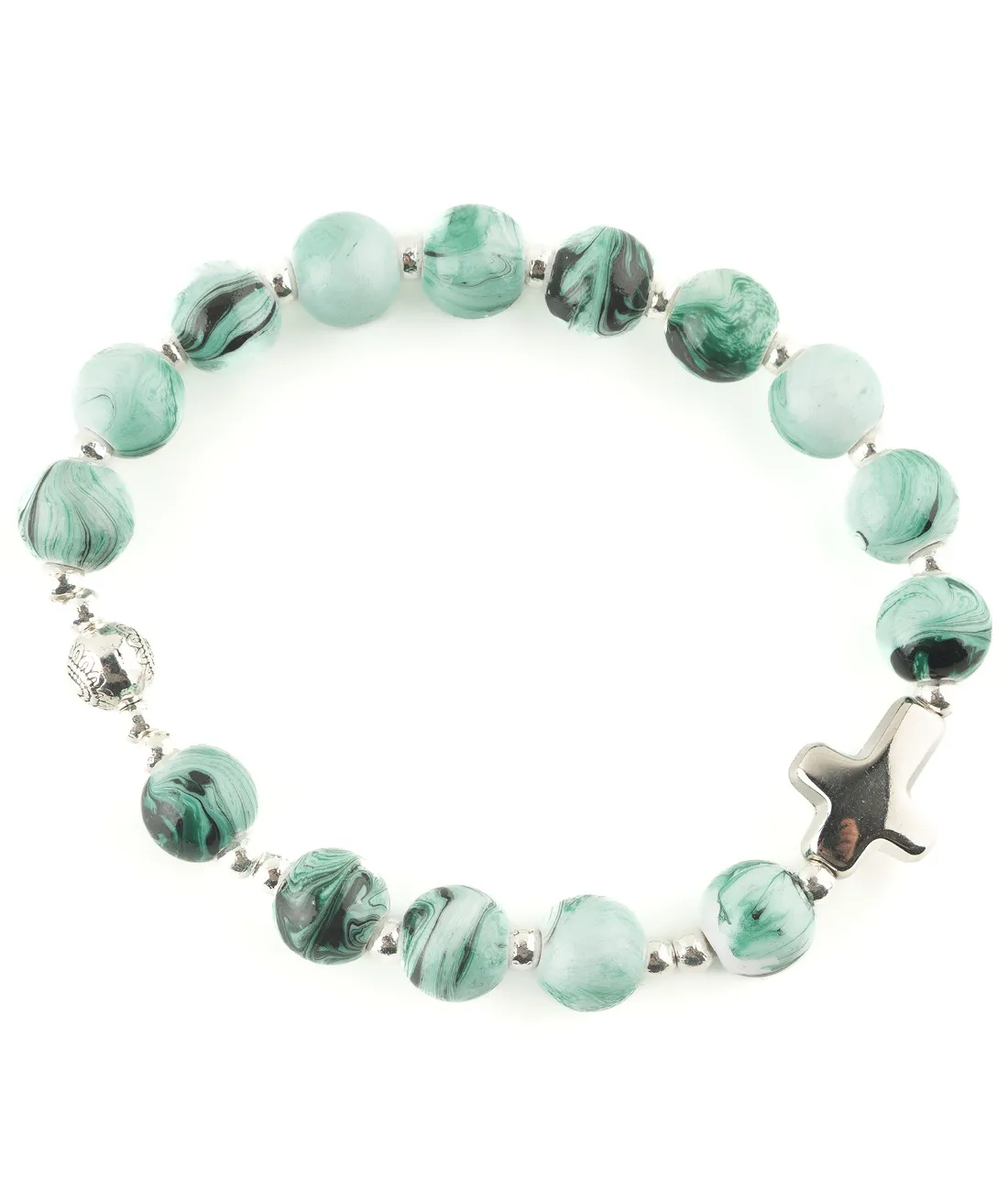 Růženec desátek se světle zelenými žíhanými korálky na gumičce a s křížkem stříbrné barvy