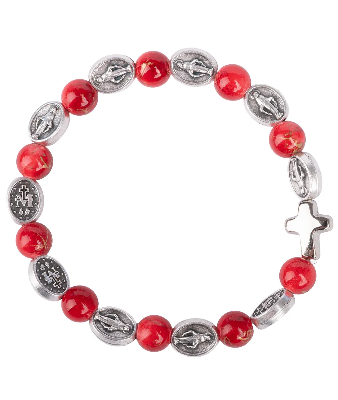 Náramek desátek se stříbrnými medailemi Zázračná medailka a s červenými žíhanými korálky.