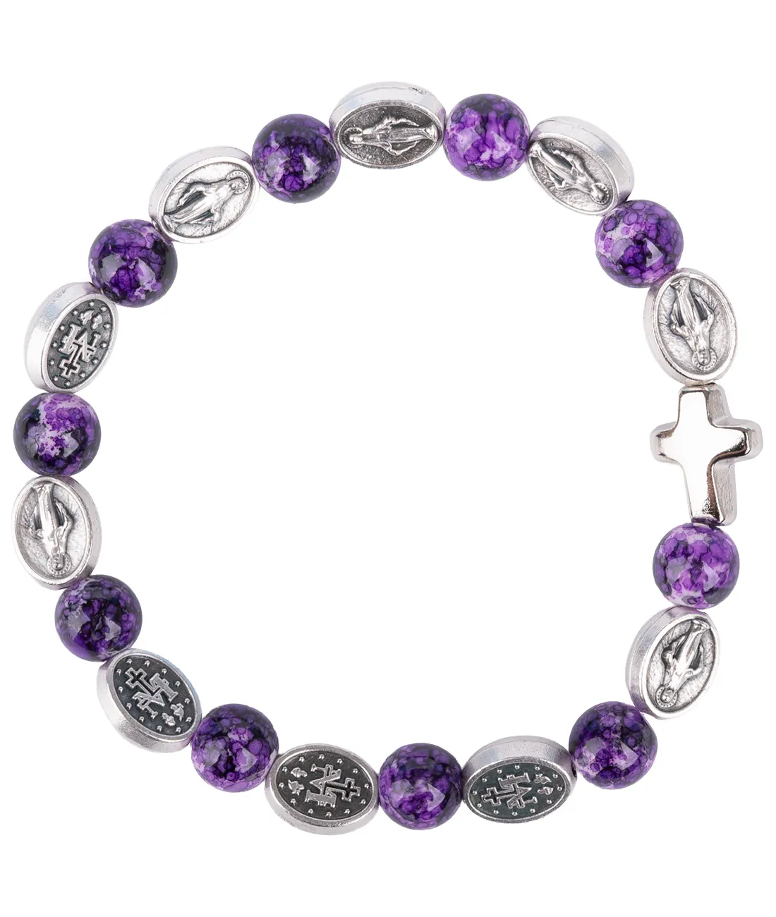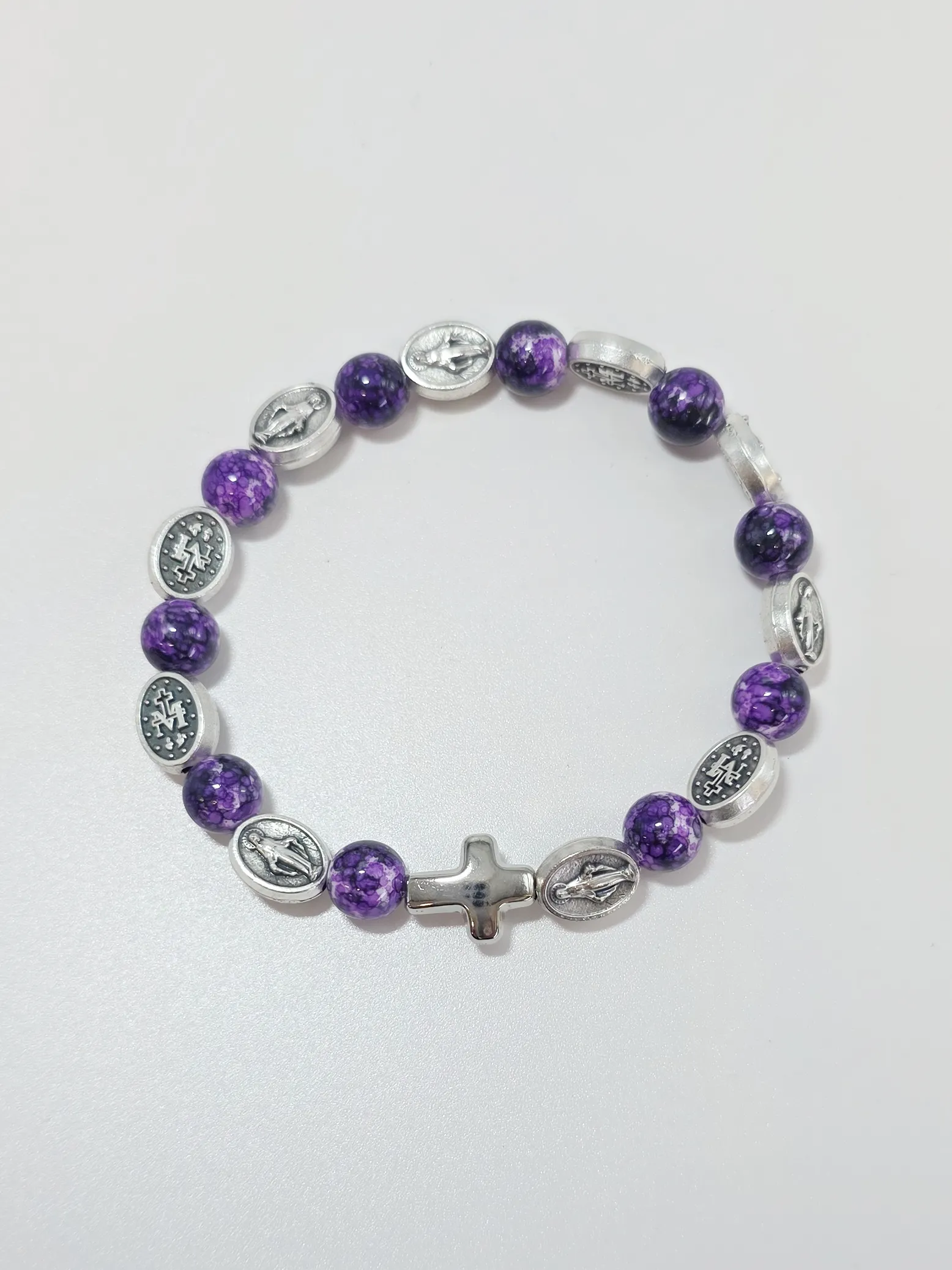 Růženec desátek jako náramek se stříbrnými medailemi Zázračná medailka a s fialovými žíhanými korálky.