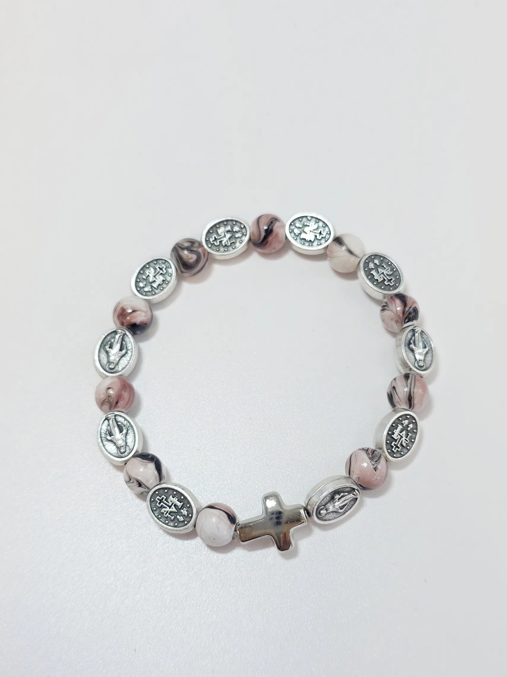 Růženec desátek jako náramek se stříbrnými medailemi Zázračná medailka a s korálky ve starorůžové barvě s žíháním.