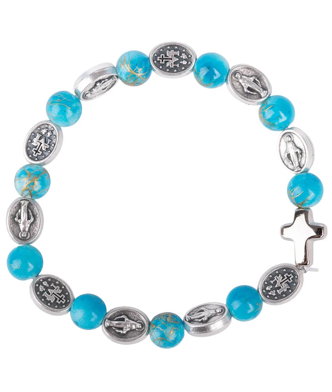 Růženec desátek jako náramek se stříbrnými medailemi Zázračná medailka a s tyrkysovými žíhanými korálky.