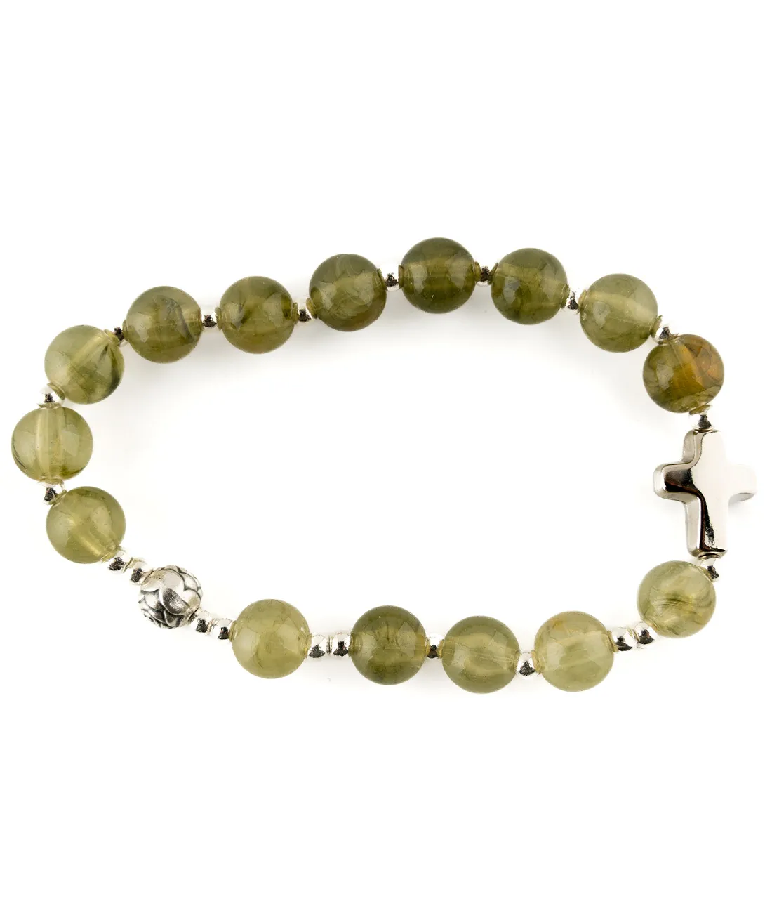 Růženec desátek se zelenými korálky na gumičce a s křížkem stříbrné barvy