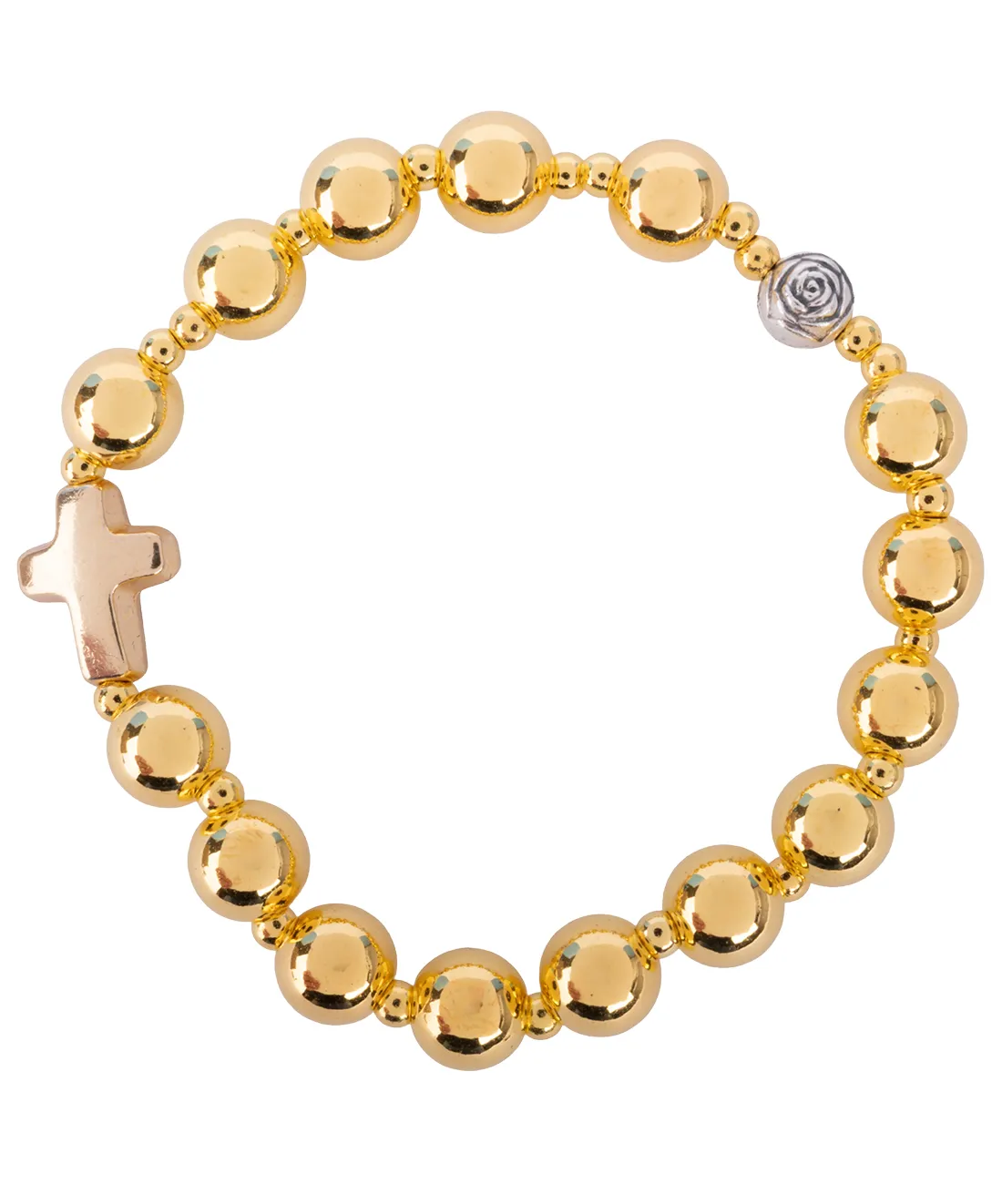 Růženec desátek ve zlaté barvě s korálky na gumičce a s křížkem.