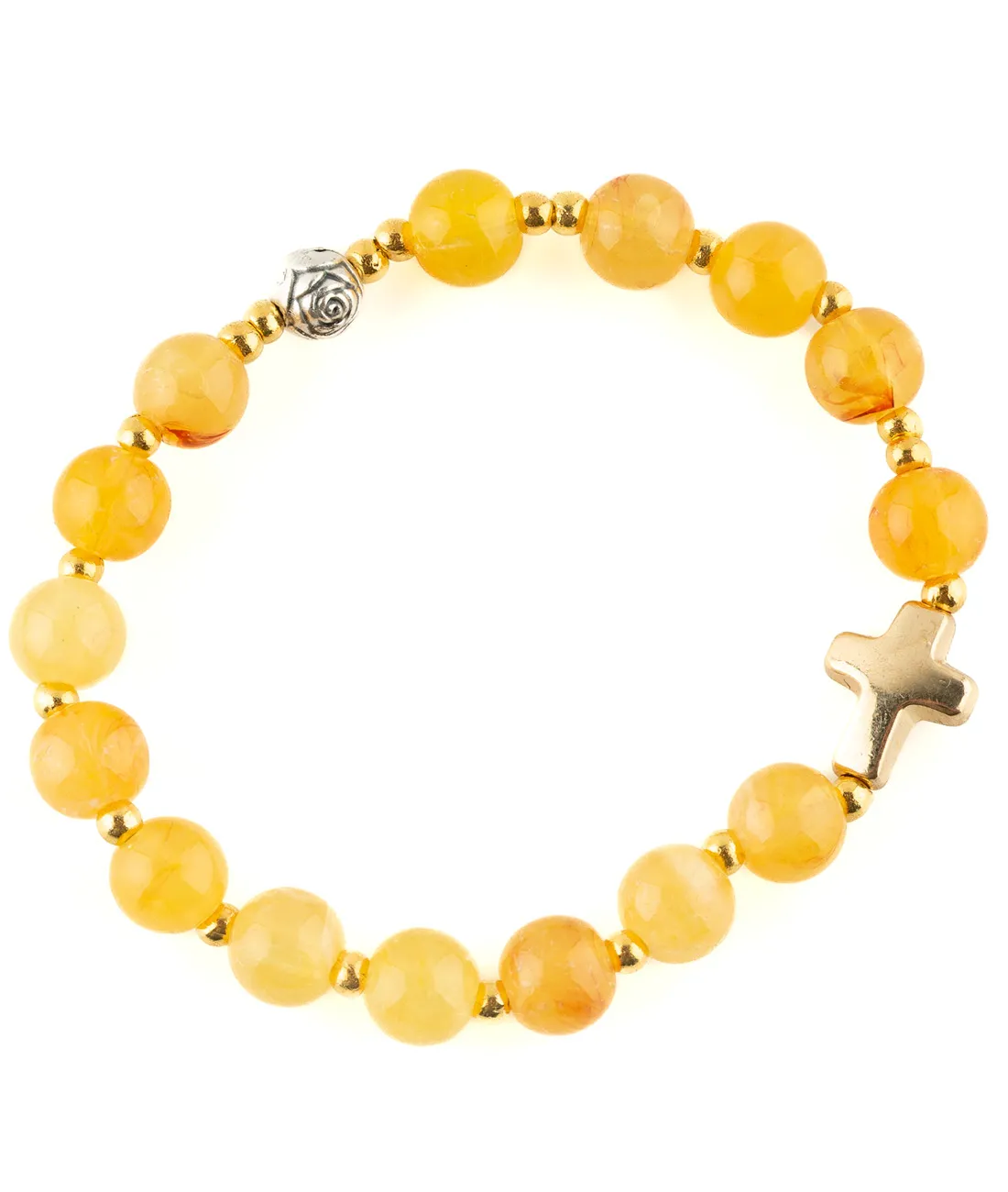 Růženec desátek se žlutými korálky na gumičce a s křížkem zlaté barvy
