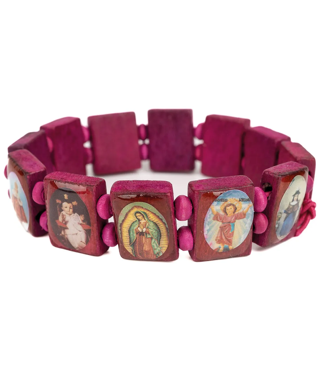 Jednoduchý dřevěný náramek s obrázky svatých v růžové barvě.