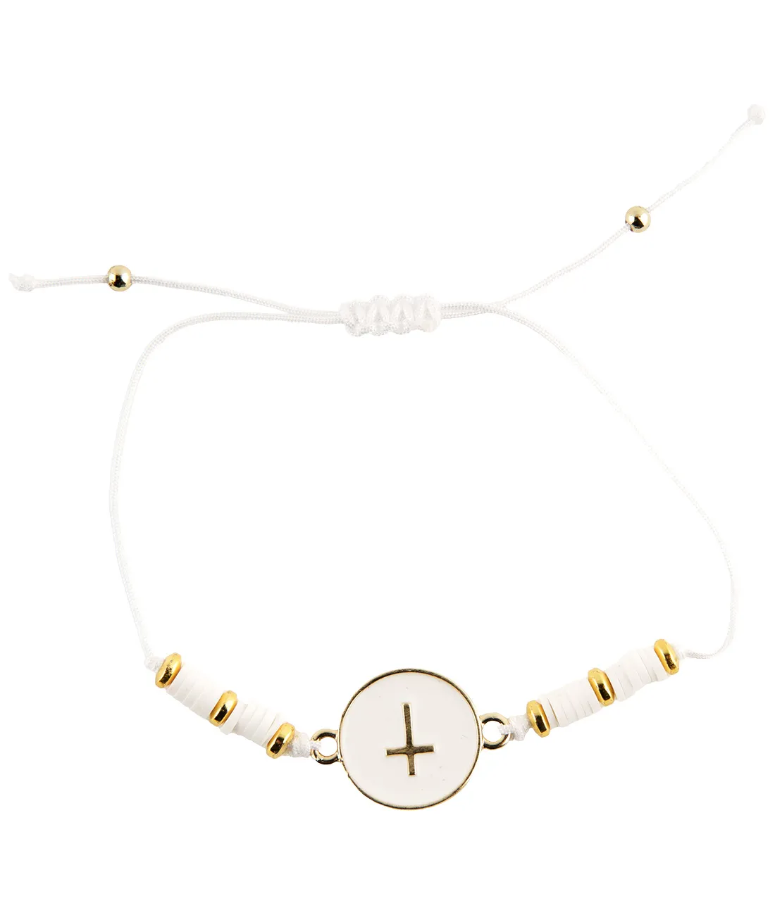 Náramek s křížkem v kolečku na šňůrce v bílé barvě.