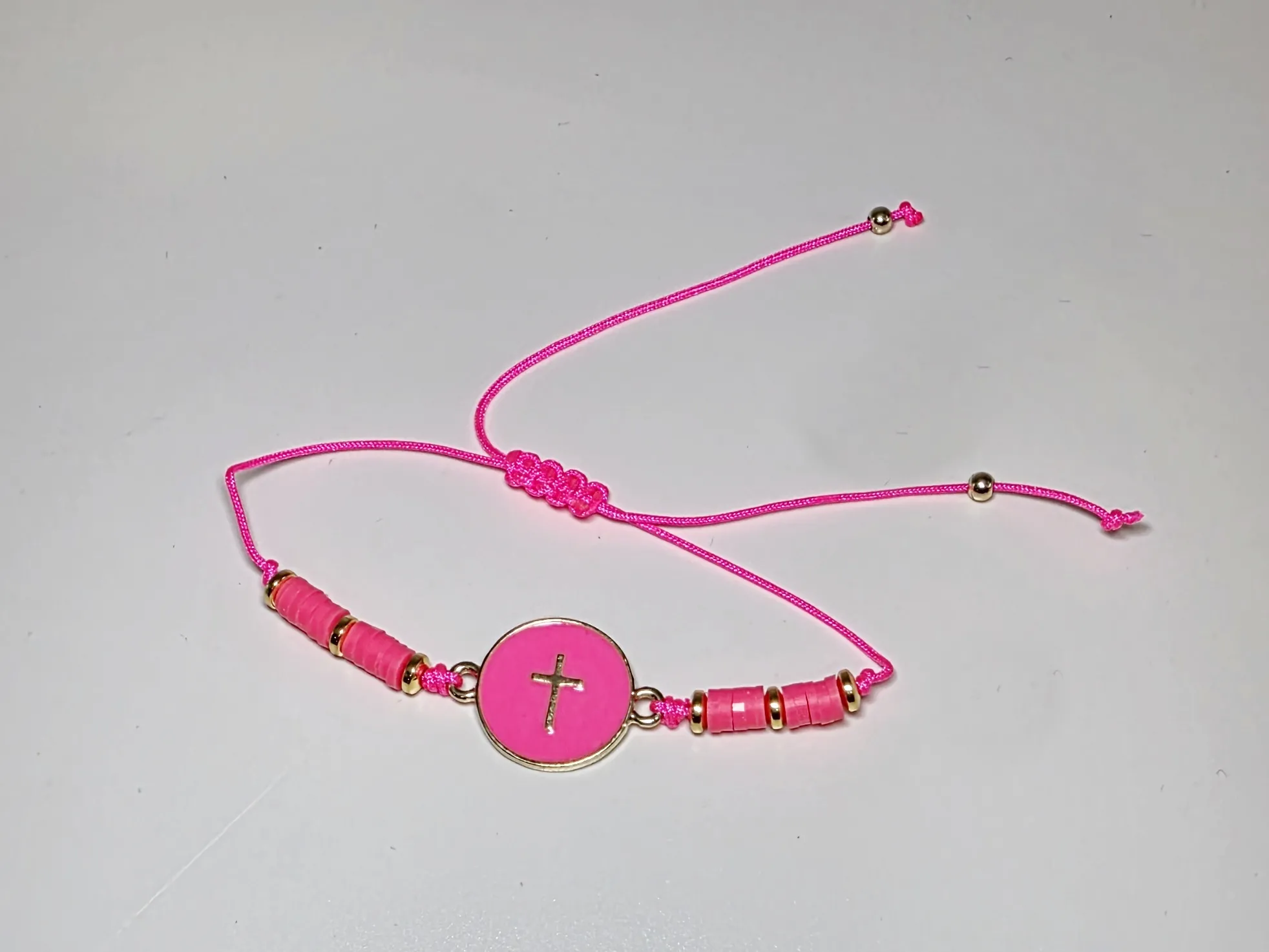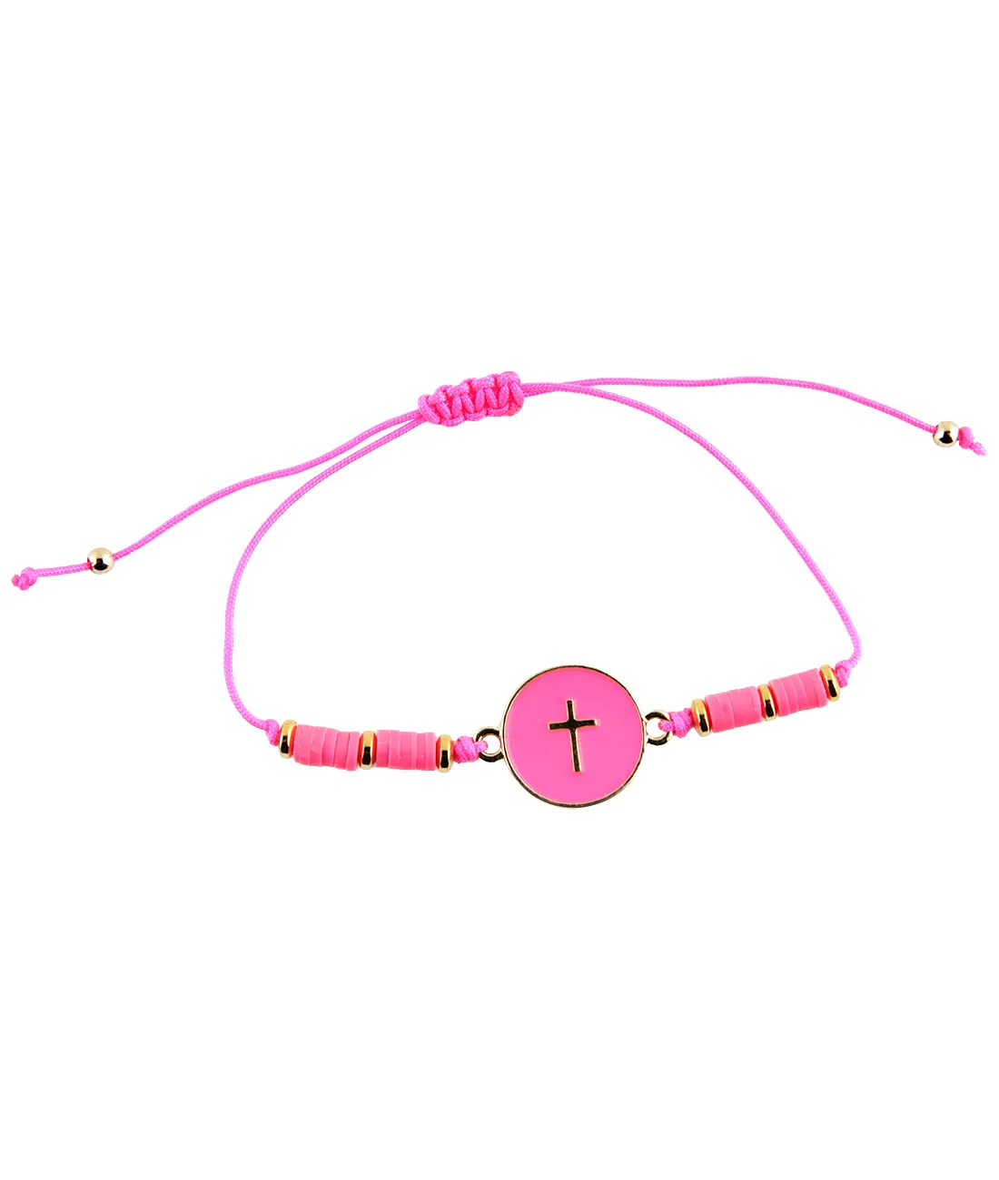 Náramek s křížkem v kolečku na šňůrce v zářivě růžové barvě.