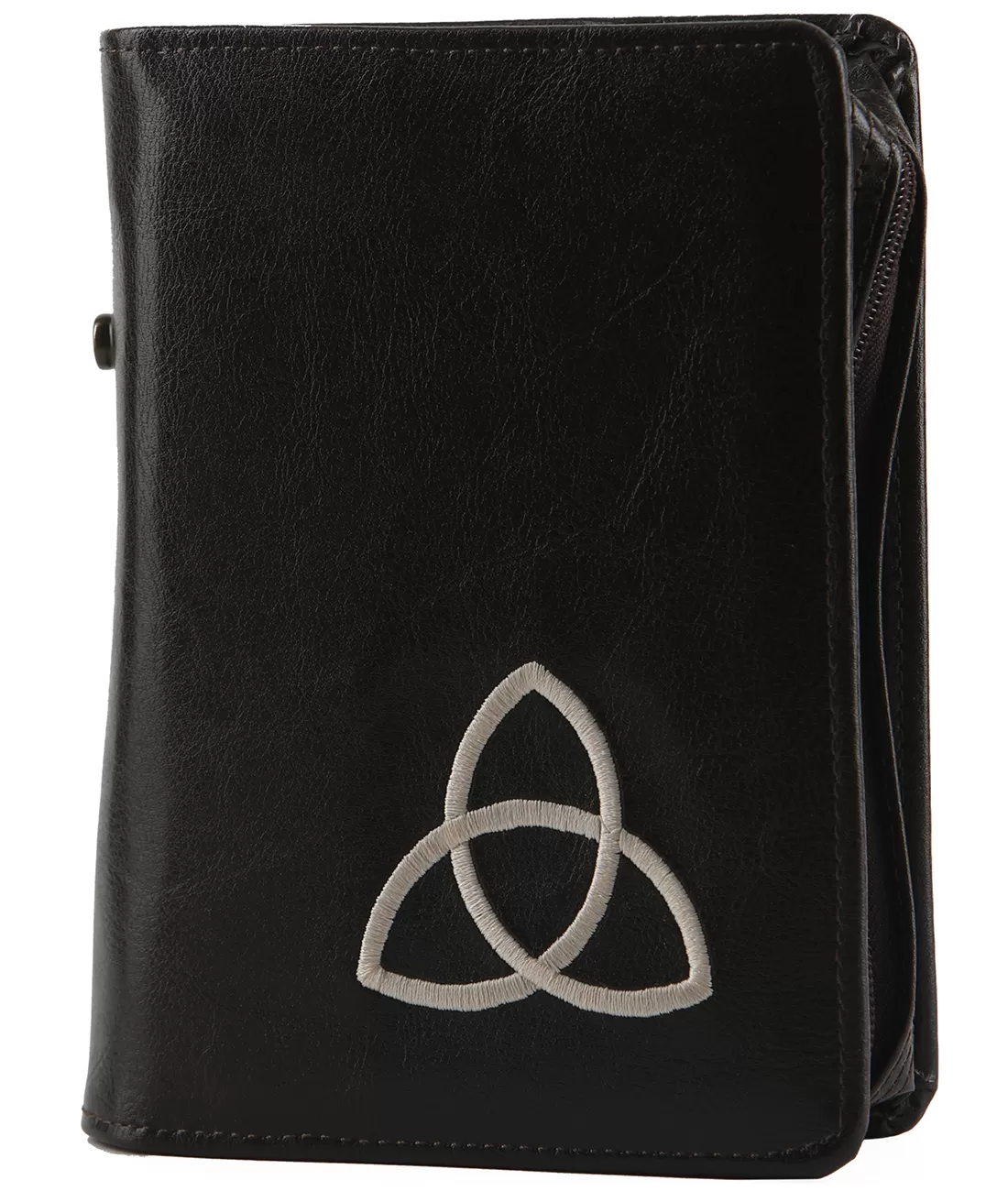 Pevný koženkový obal tmavě hnědé barvy s bíle vyšitým symbolem Nejsvětější Trojice, který spolehlivě ochrání váš Breviář.