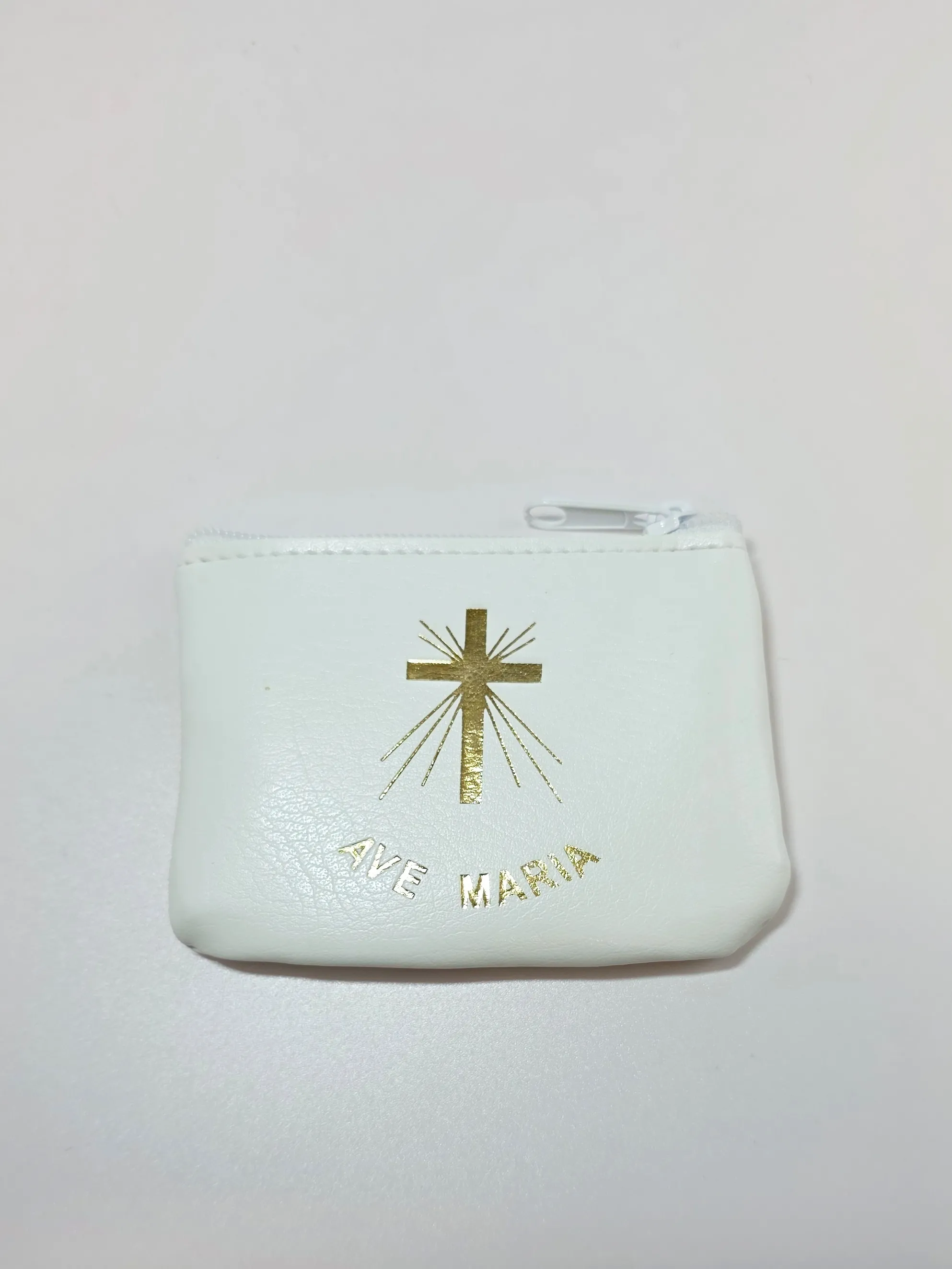Bílé koženkové pouzdro na růženec se zipem. Teď se vám již Váš oblíbený růženec neztratí ani nepoškodí. Vhodné též jako dárek.