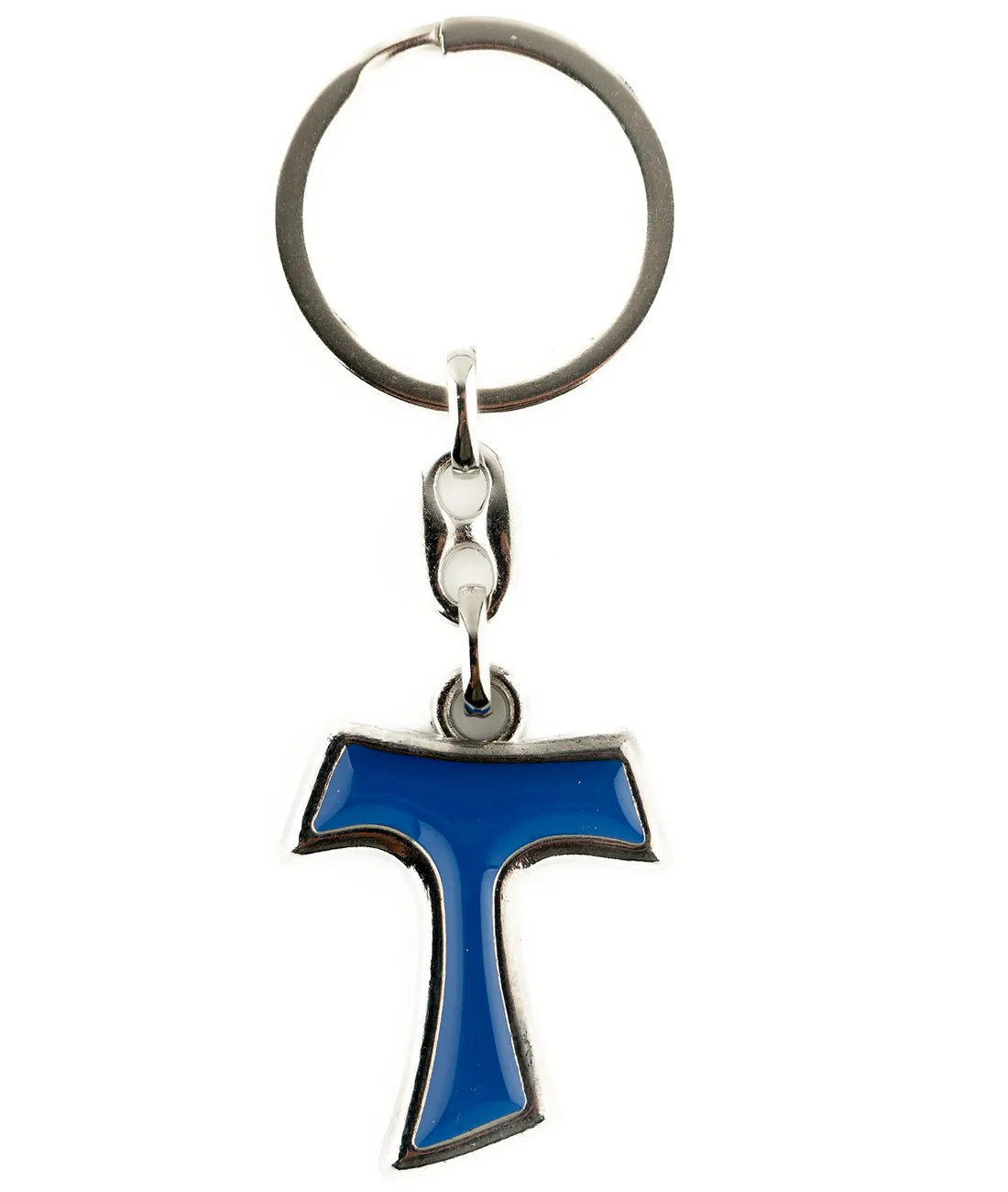 Kovový přívěšek na klíče v modré barvě - kříž Tau o velikosti 3 cm