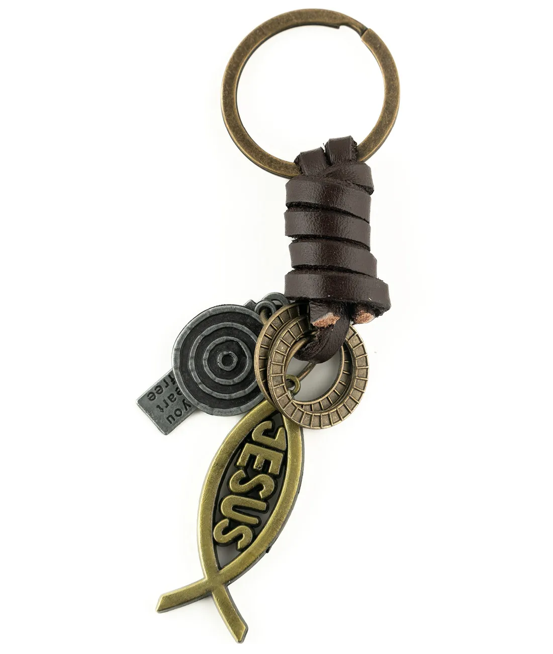 Přívěšek na klíče v kombinaci kůže a kovu v barvě mosazi.