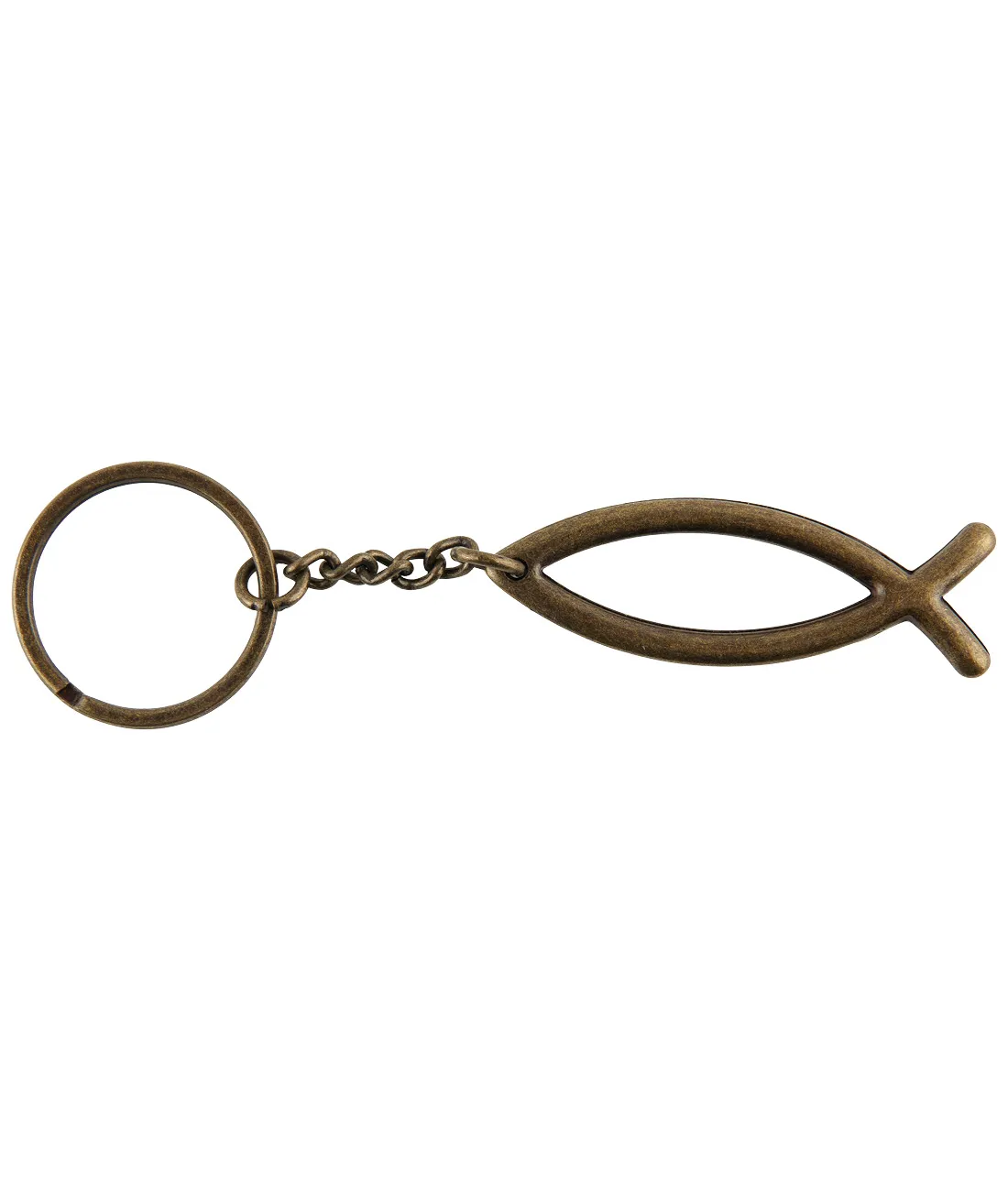 Kovový přívěšek na klíče s křesťanským symbolem ryby v barvě mosazi.
