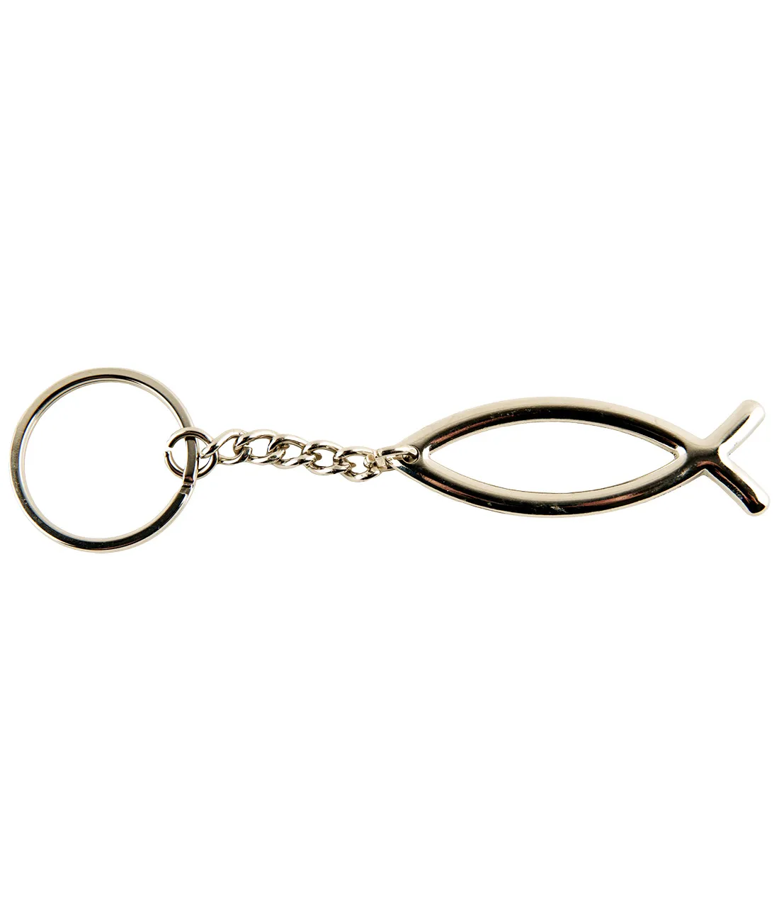 Kovový přívěšek na klíče s křesťanským symbolem ryby v barvě stříbrné.