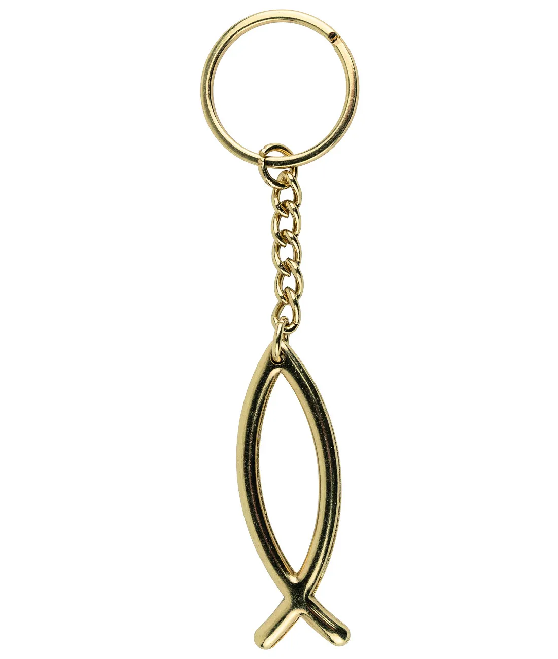 Kovový přívěšek na klíče s křesťanským symbolem ryby ve zlaté barvě.