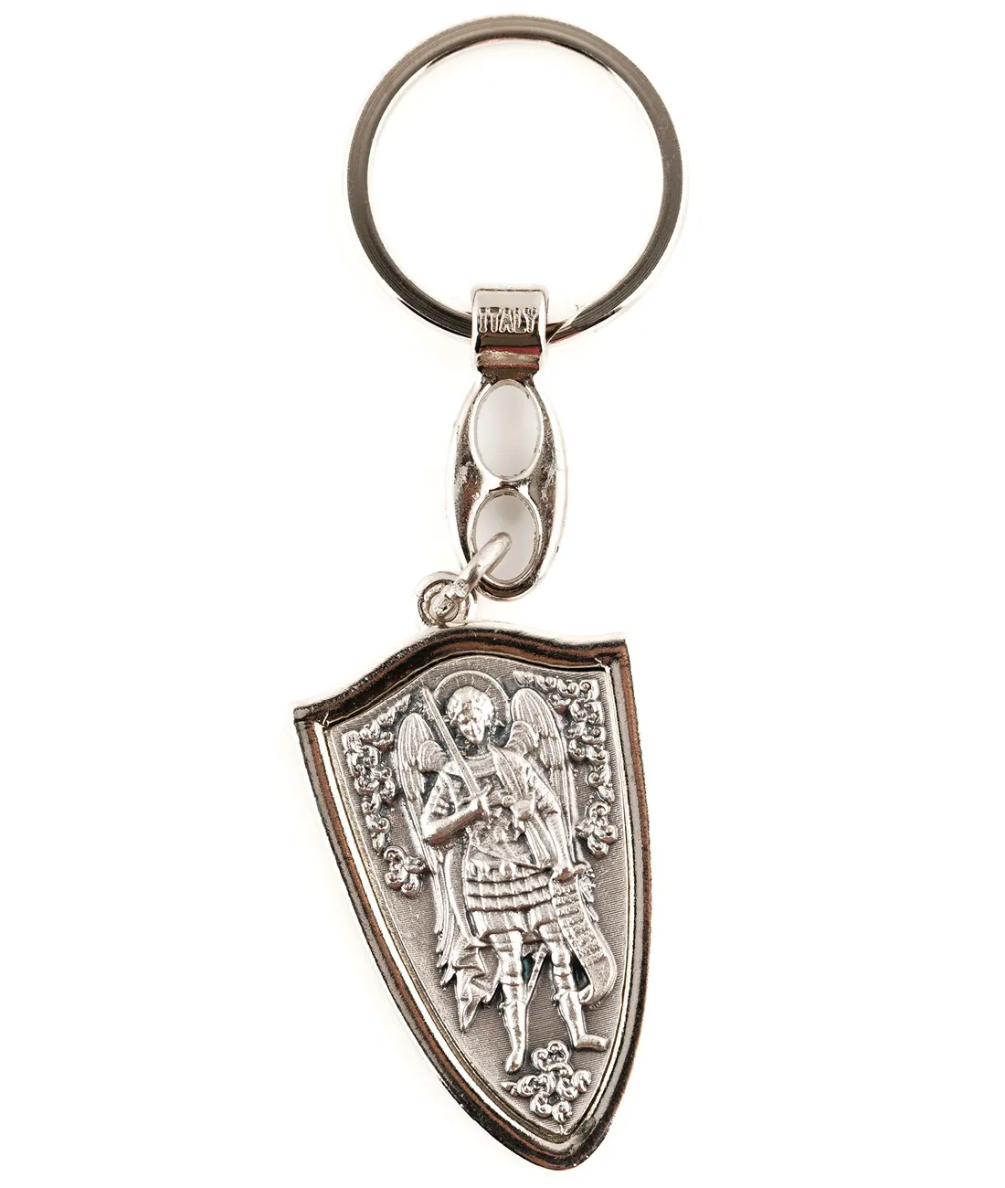 Kovový přívěšek na klíče se Svatým Archandělem Michaelem o délce 8,5 cm.