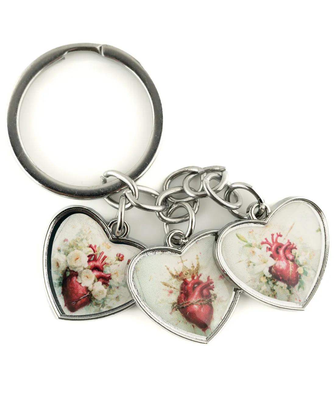 Přívěšek na klíče s třemi zavěšenými srdíčky, každé s vyobrazením srdce jedné z postav Svaté Rodiny.