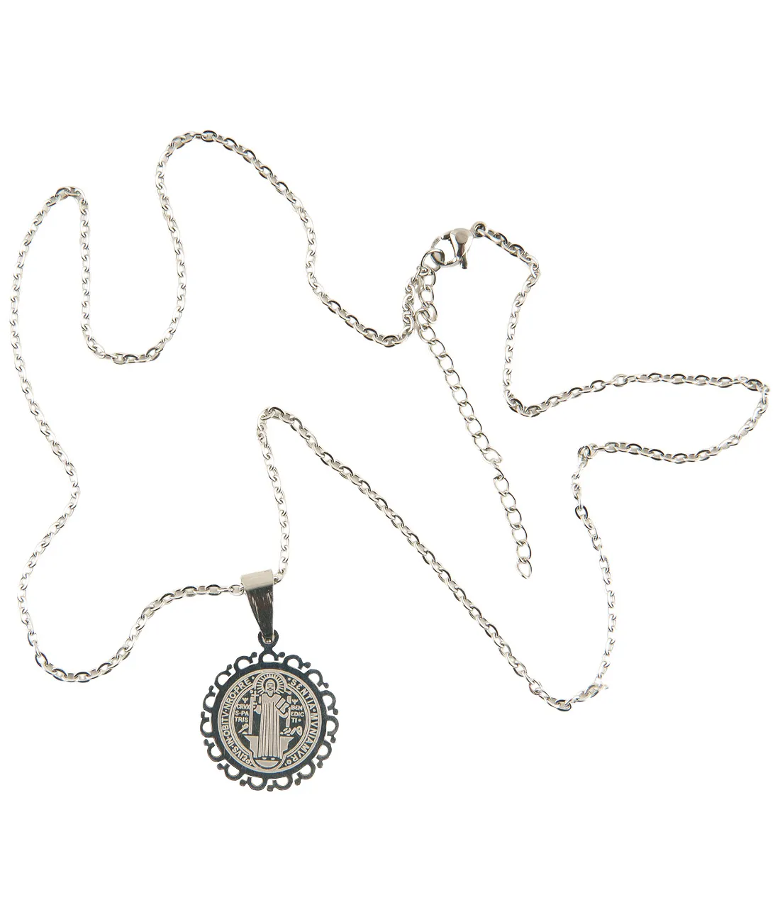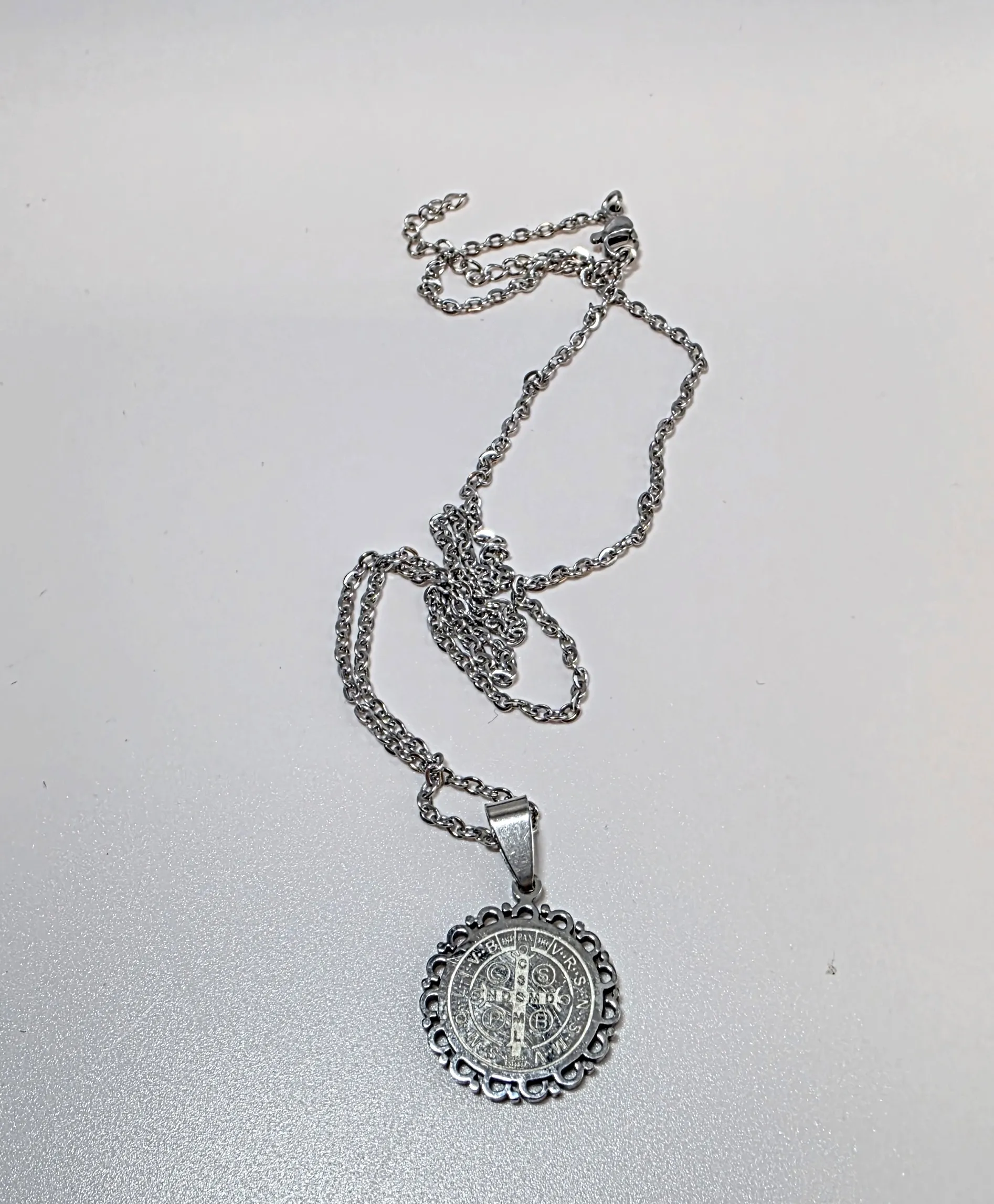 Na přední straně medailky je sv. Benedikt a na straně zadní je kříž.