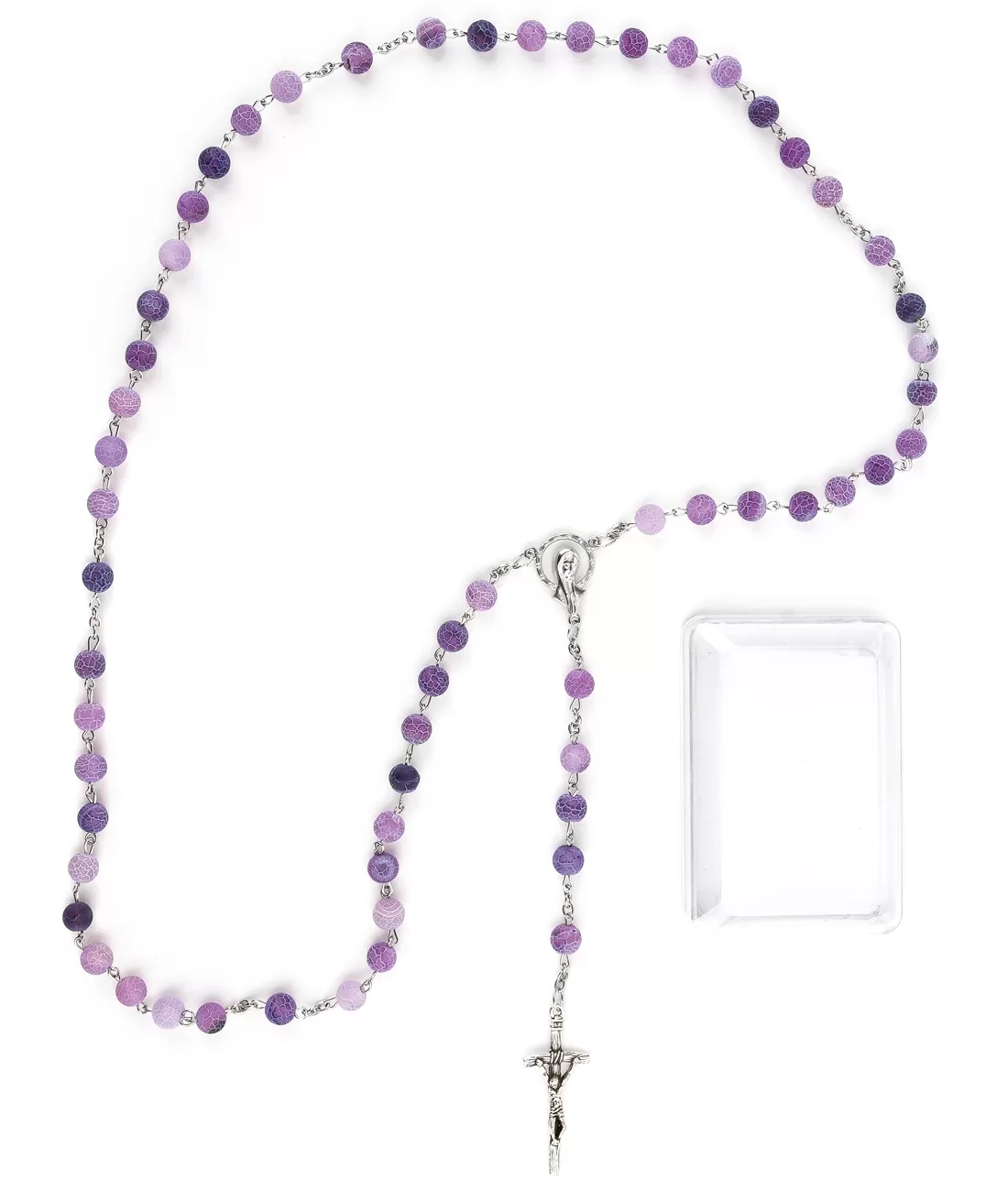 Růženec s korálky z přírodního, ledového minerálu achátu o průměru 8 mm, medailkou Panny Marie a křížkem o velikosti 4 cm. Korálky jsou přírodní a jsou uměle dobarvovány do požadovaného odstínu.