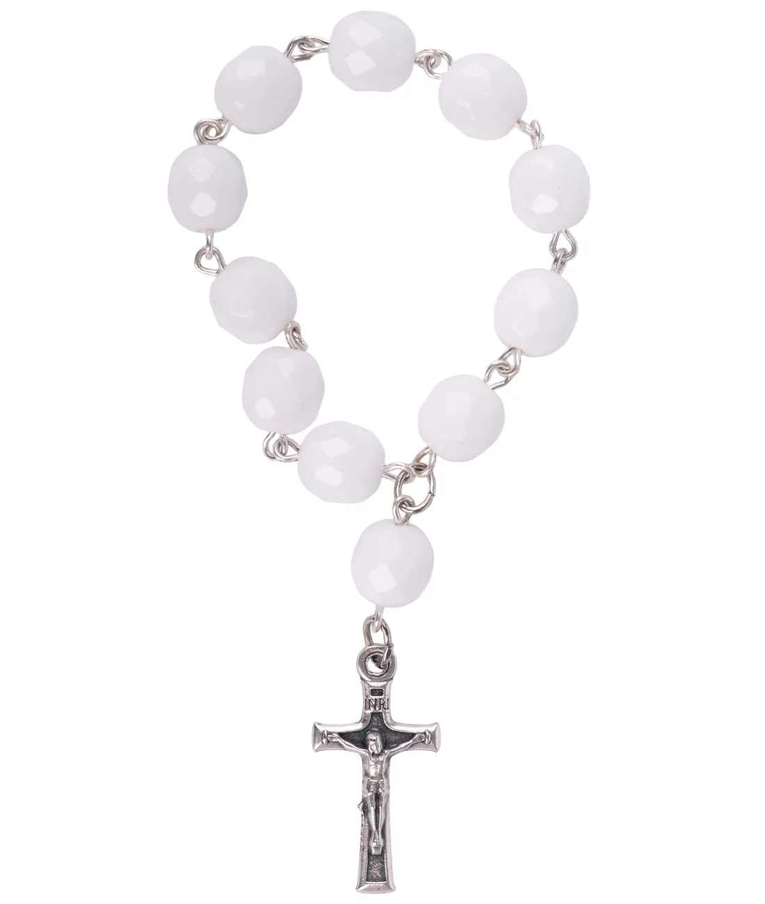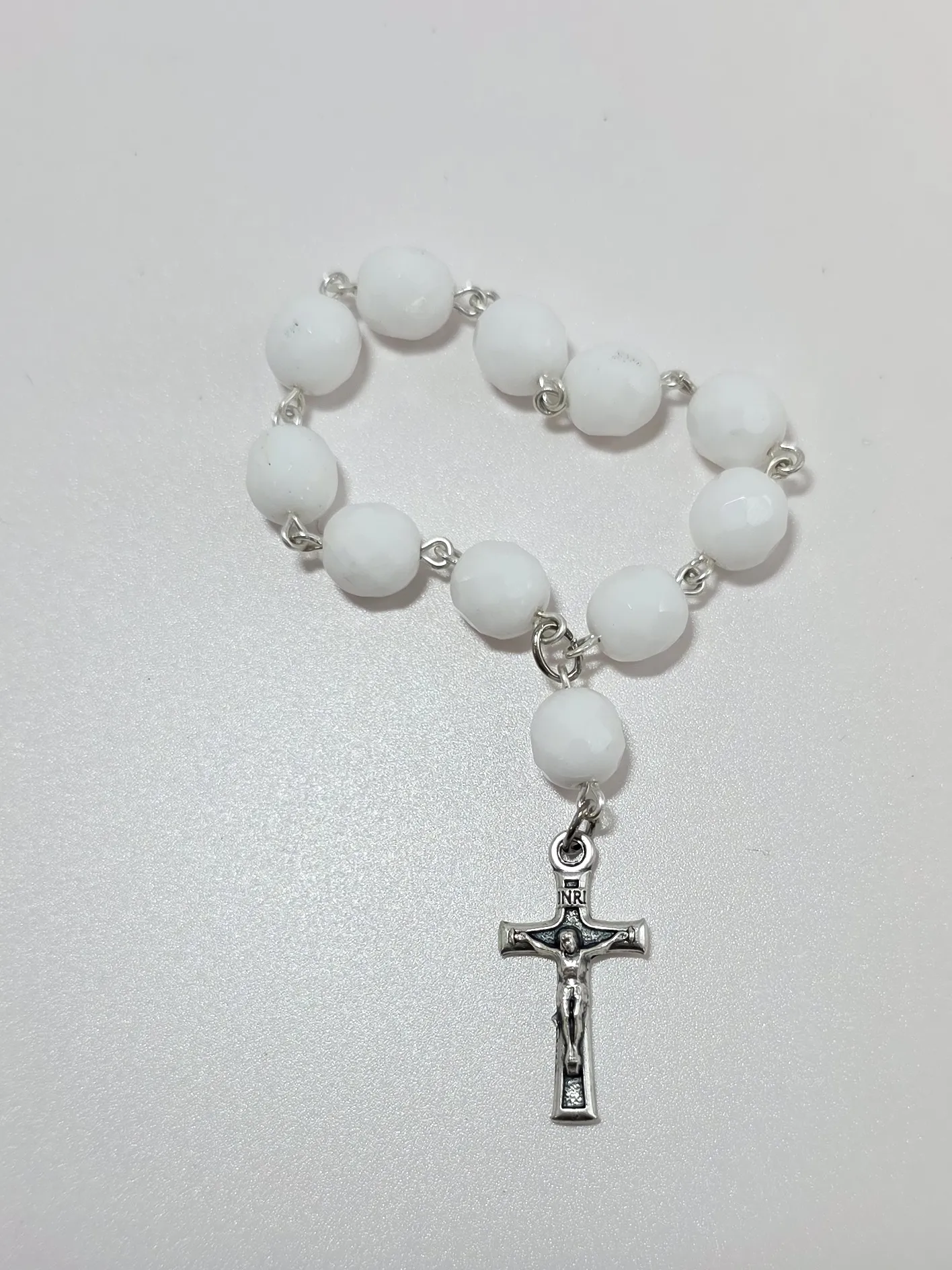Růženec desátek s bílými většími korálky a s kovovým křížkem.