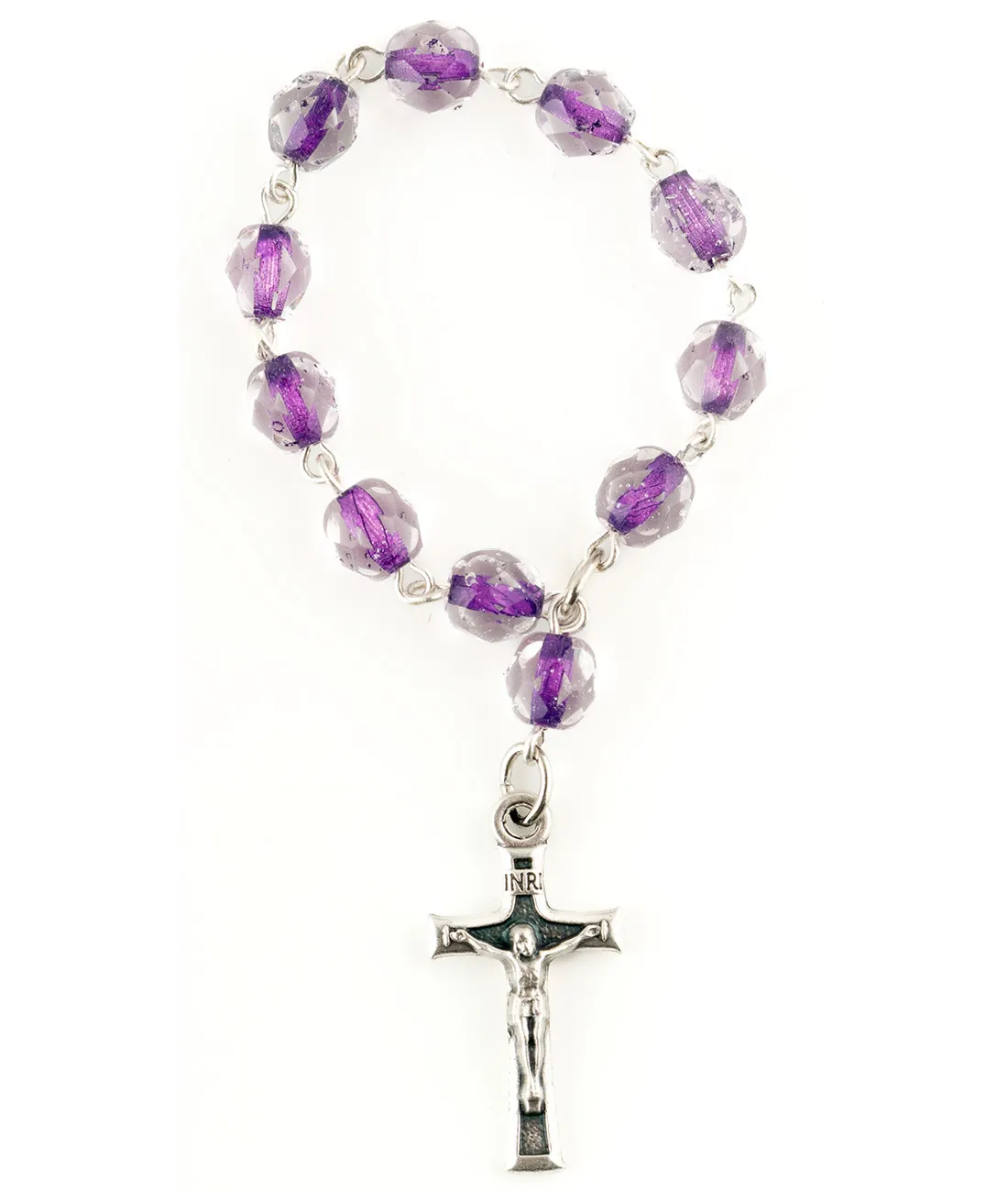 Růženec desátek s průhlednými fialovými korálky a s kovovým křížkem.