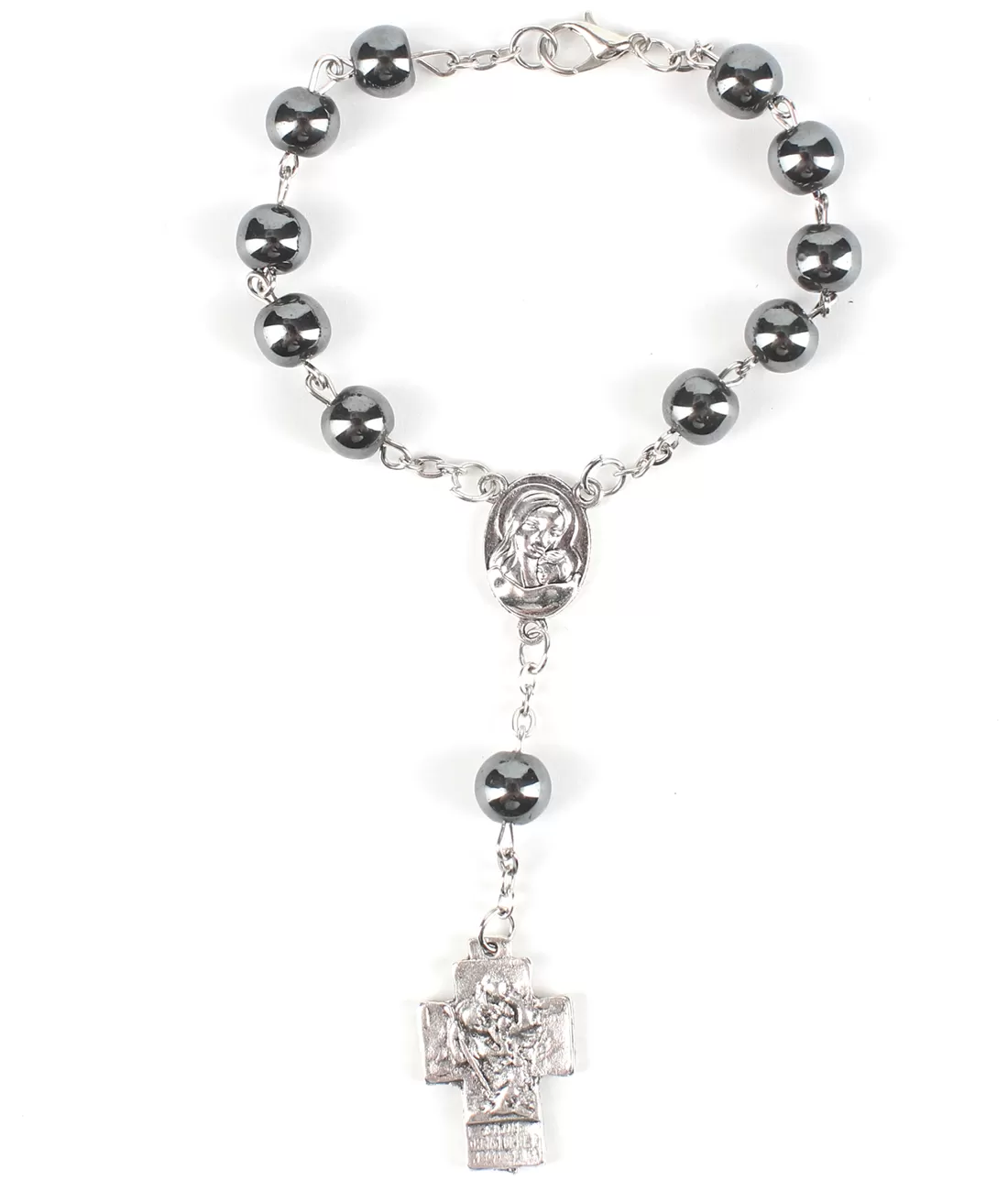 Růženec desátek z kamene hematitu, se sv. Kryštofem a pískem ze Svaté země. Hematit je lidem znám již od starověku. Využíval se jako talisman přinášející štěstí a poskytující ochranu. Od středověku je již obvyklé jeho použití ve šperkařství. Hematit je mezi lidmi běžně známý pod názvem krevel. Obvykle si jej představíme v šedočerné barvě s jako kovovým leskem, ale může mít i hnědou až červenou barvu.