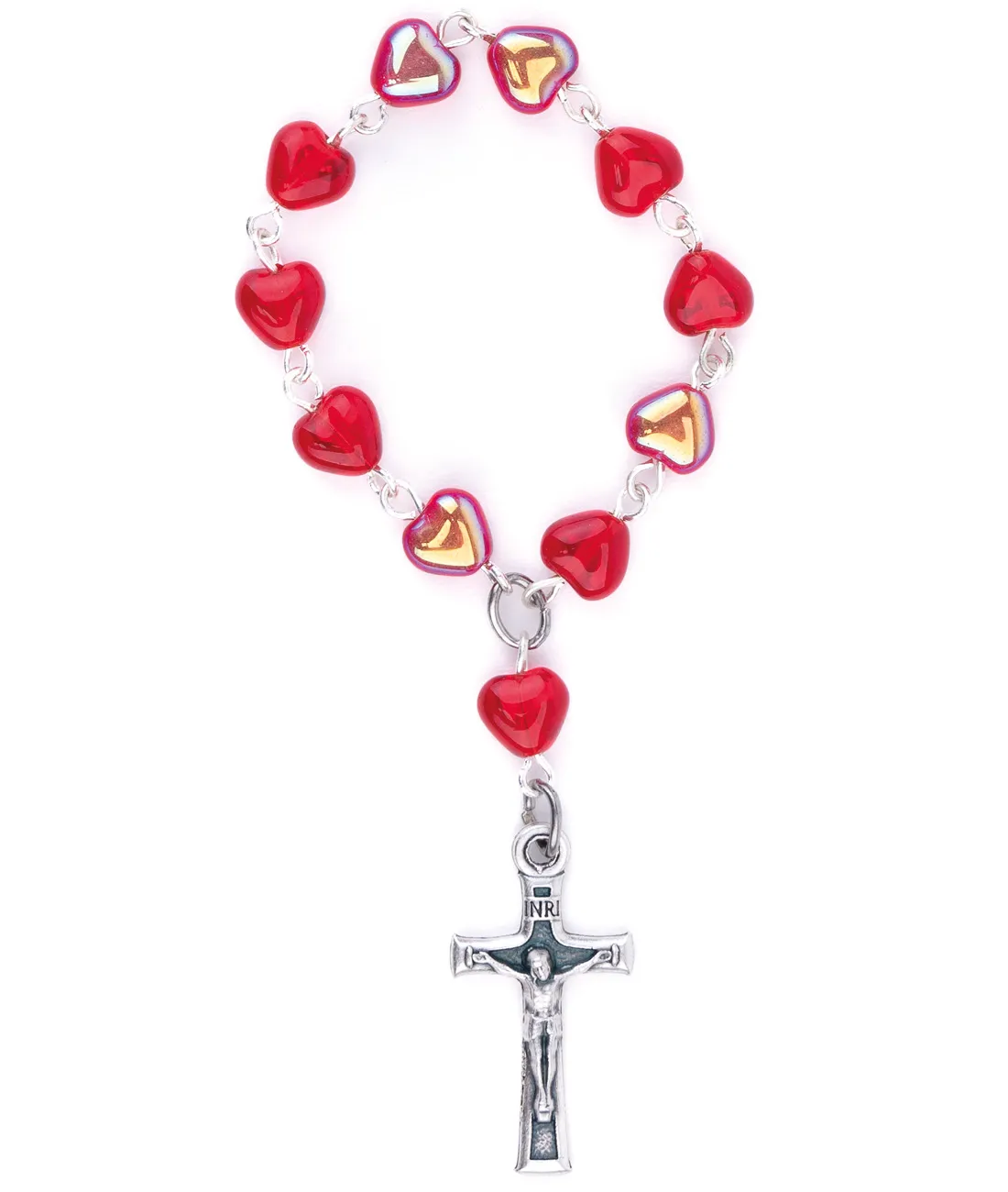 Růženec desátek s červenými korálky ve tvaru srdce s kovovým leskem a se stříbrným křížkem.