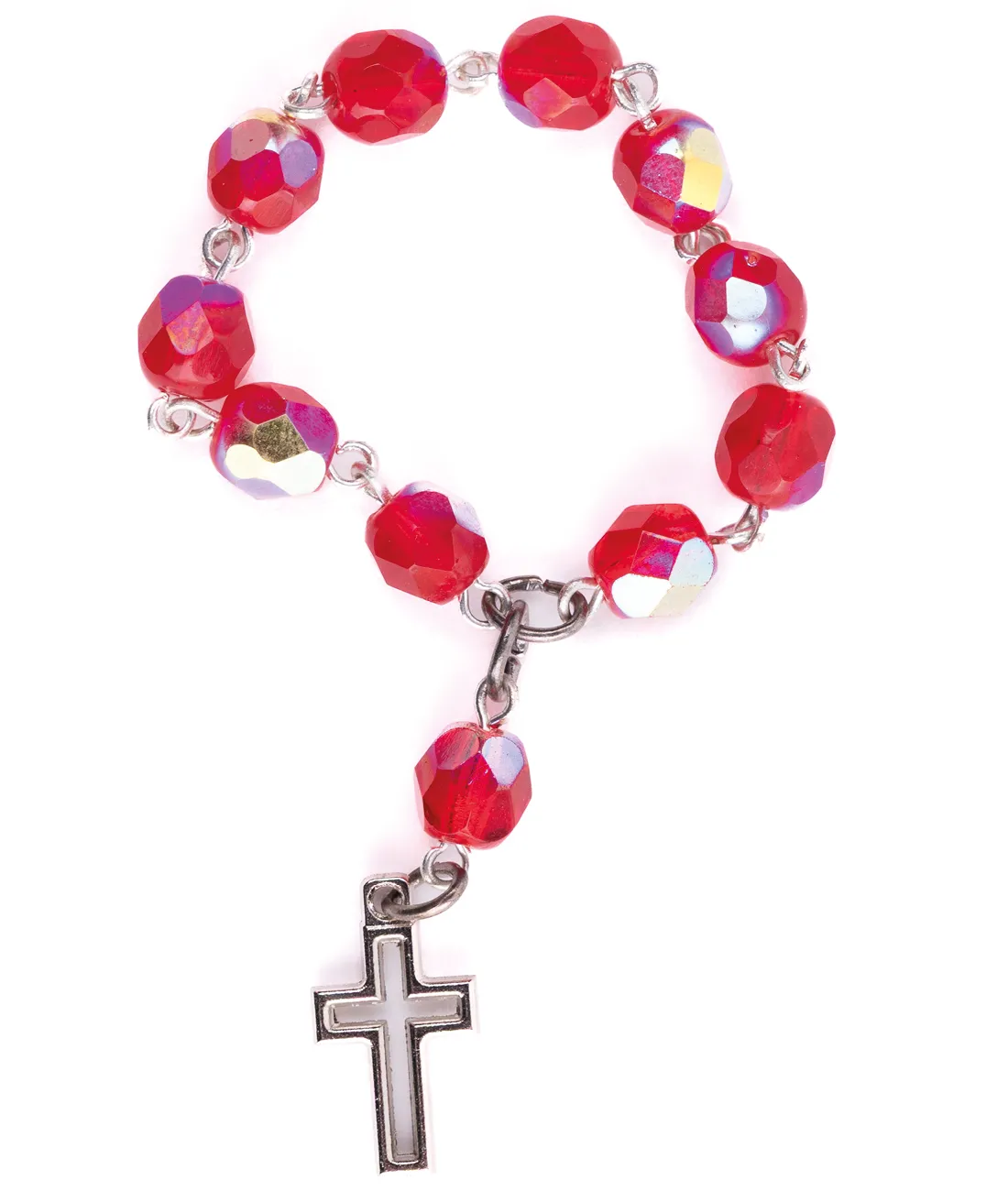 Růženec desátek s kovově červenými korálky a s obrysovým křížkem.
