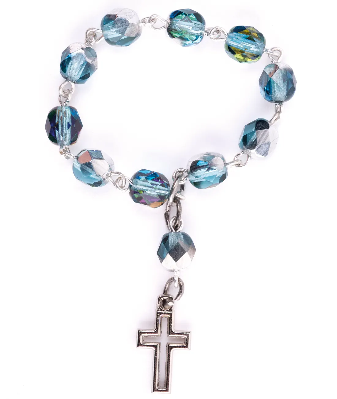 Růženec desátek s kovově modrými korálky a s obrysovým křížkem.