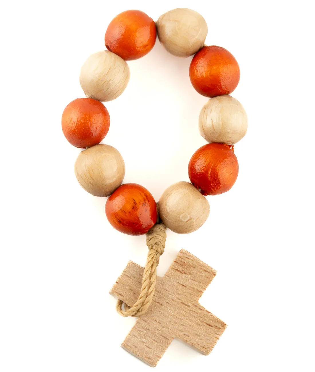 Malý růženec desátek s dřevěnými korálky a dřevěným křížkem v barvě přírodní a oranžové.