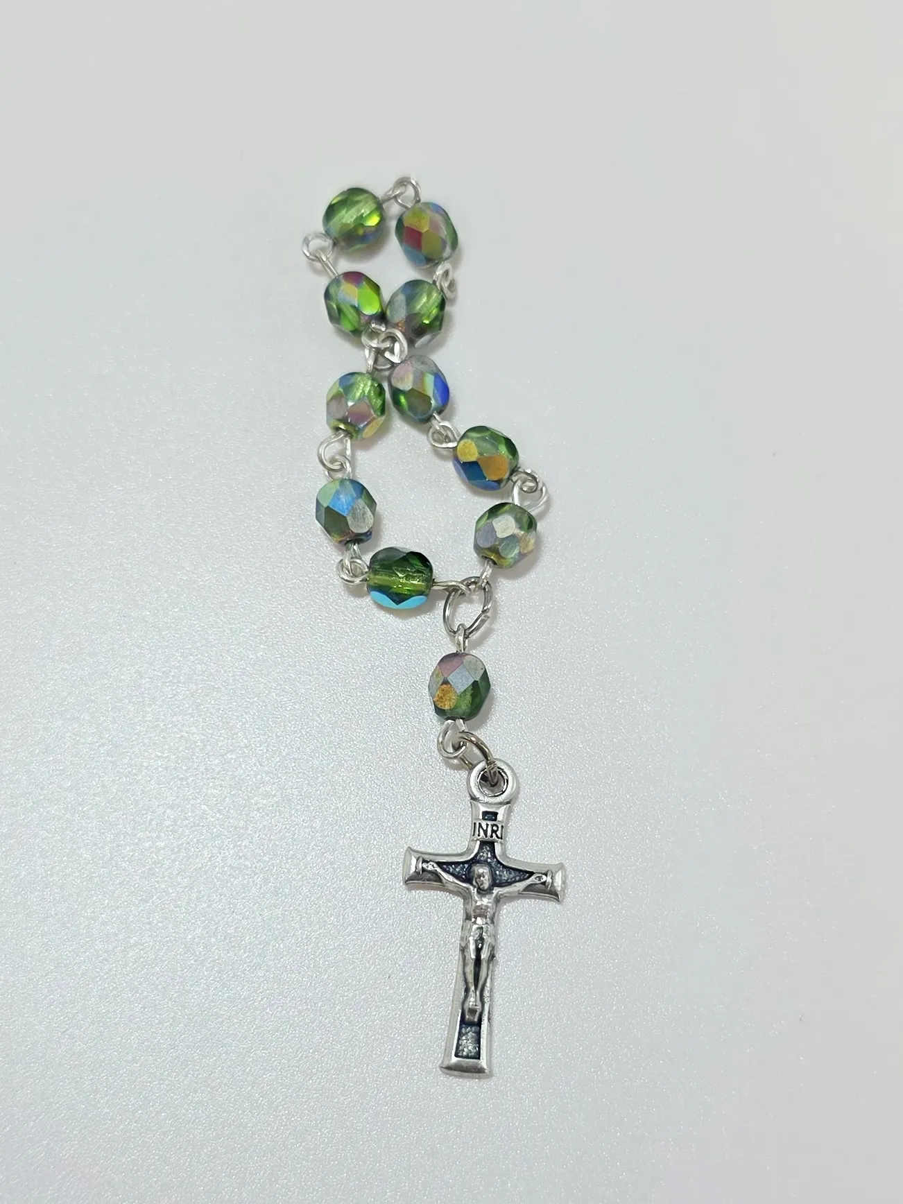 Růženec desátek s broušenými korálky barvy oliv s kovovými odlesky a s kovovým křížkem.
