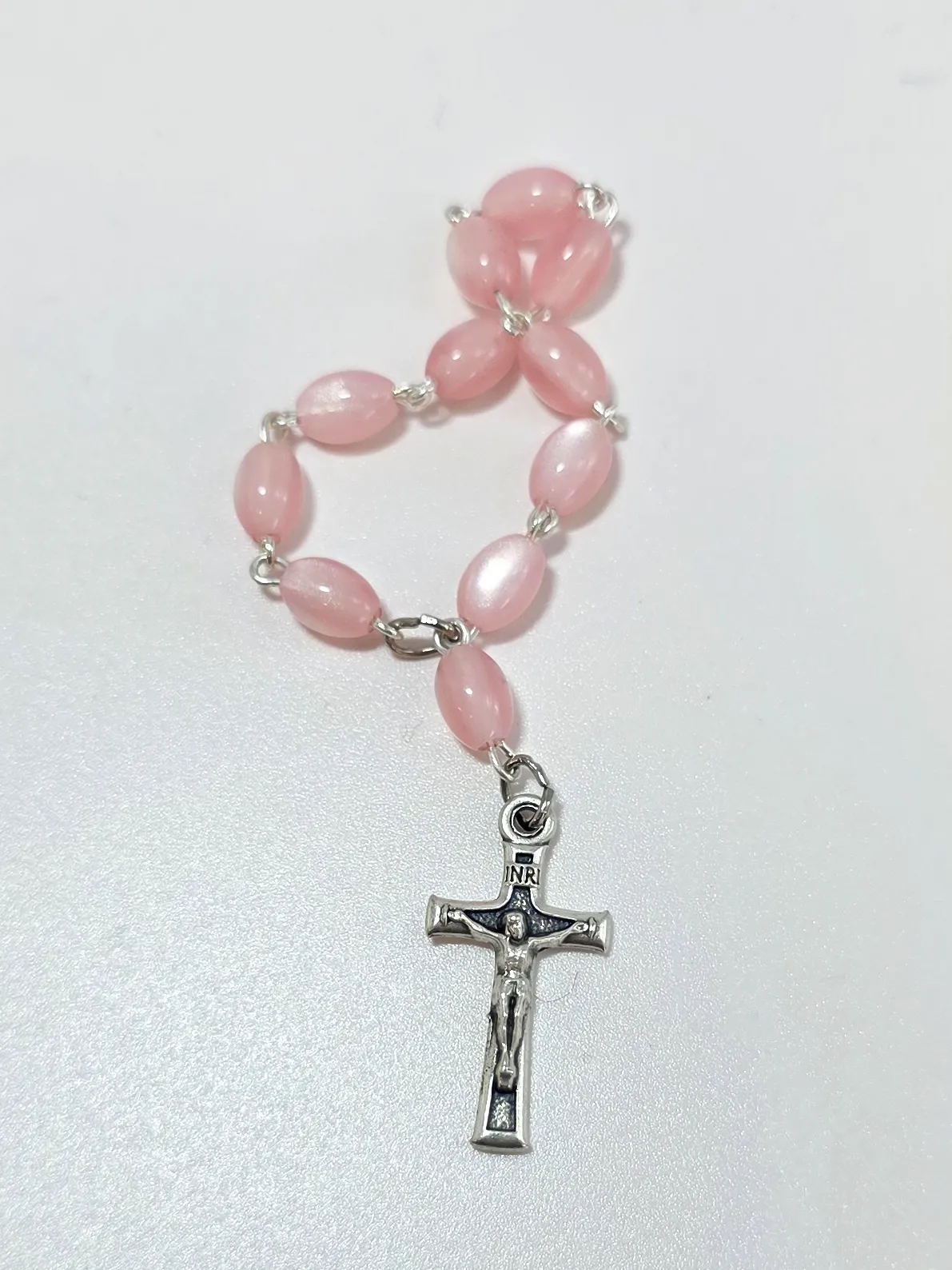 Růženec desátek s růžovými perleťovými oválnými korálky a s kovovým křížkem.
