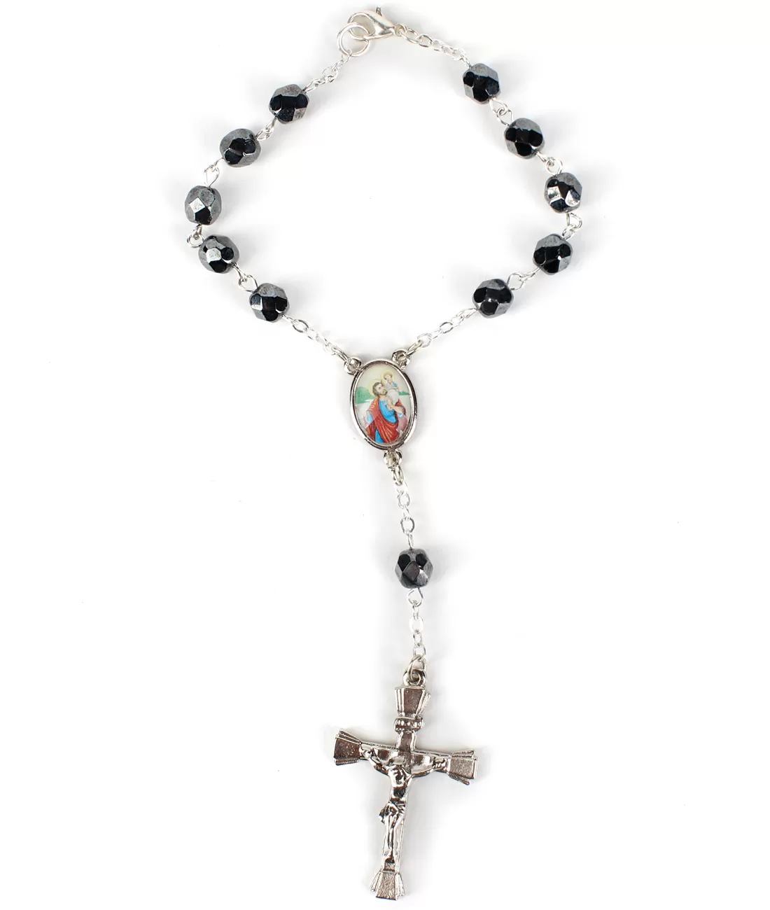 Malý růženec (desátek) z 11 ohněm leštěných perlí ve velikosti 6mm s karabinkou a barvou černá s dekorem hematit.