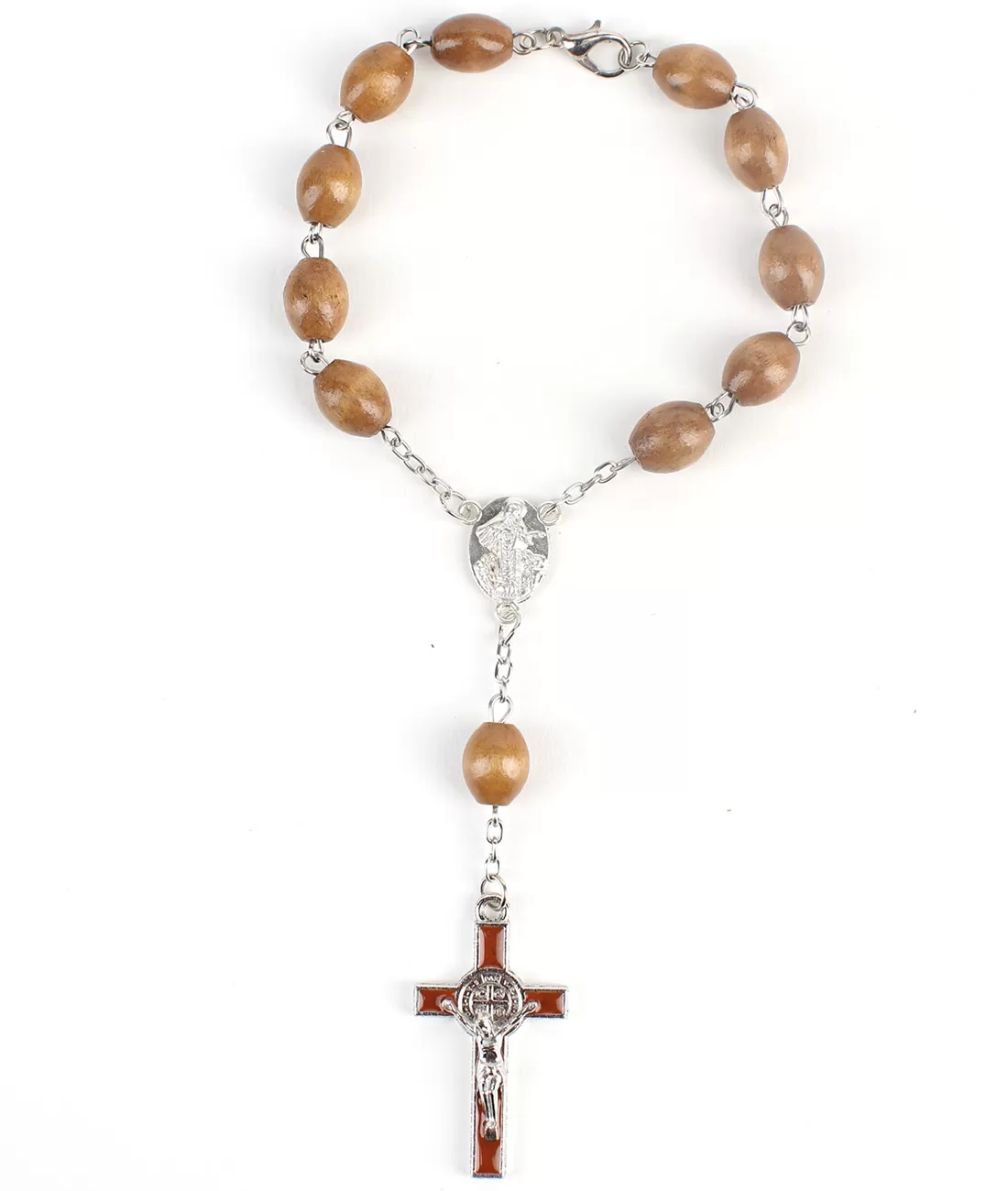 Růženec desátek s většími dřevěnými perlami v barvě světle hnědé na drátku, s kovovým křížem sv. otce Benedikta o velikosti 3,5 cm. Důležité je, aby „nápis proti zlému duchu“ nezůstal jen na kříži, ale aby byl stále přítomný i ve vašem srdci! Ochranu proti zlu získáváme mj. tím, že do svého srdce stále zveme Krista - přemožitele zla, že se snažíme žít v jeho blízkosti, že se modlíme, čteme Boží slovo, že hledáme Boží plán pro svůj život a snažíme se jej naplňovat. To je to, co nás chrání, to j…e to, čeho se zlý duch bojí. Kříž je pak jen jednou z dobrých pomůcek, jak na Krista - přemožitele zla a průvodce k naplněnému životu nezapomínat.