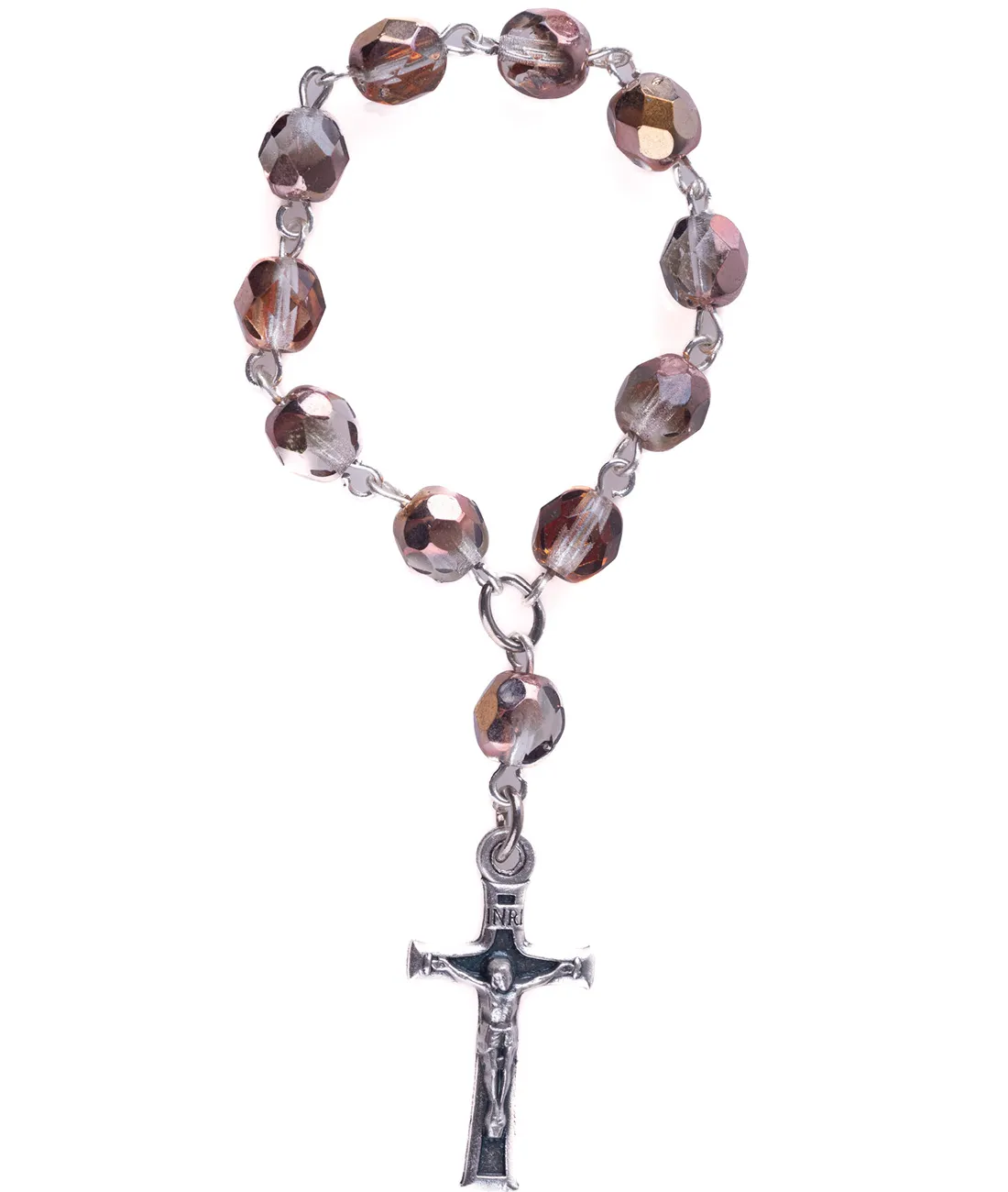 Růženec desátek se skleněnými broušenými korálky v sépiové barvě se stříbrným křížkem.