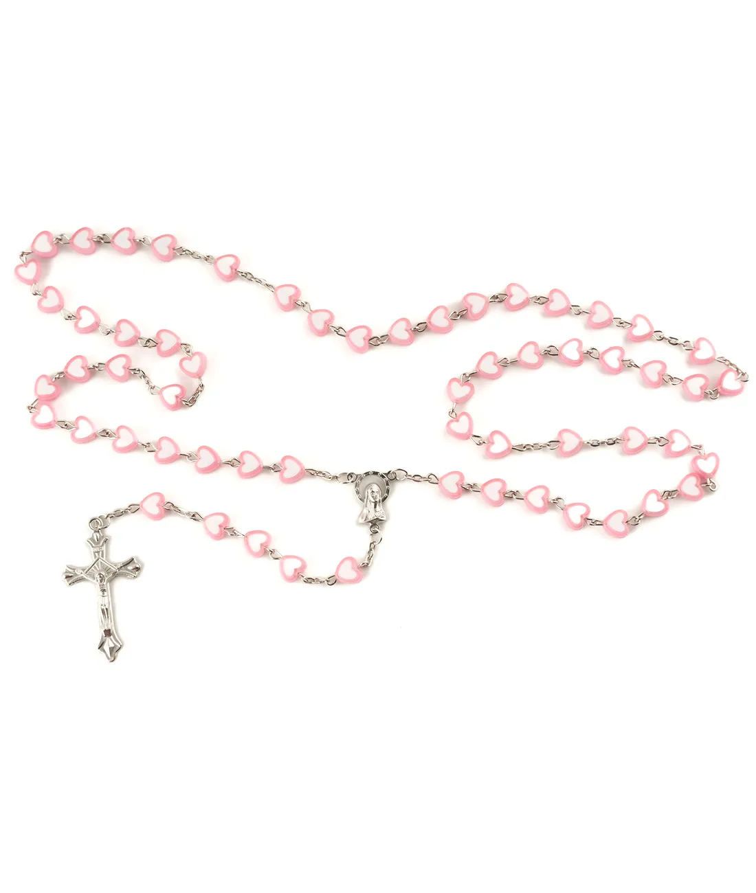 Růženec pro děti s korálky ve tvaru srdce v barvě růžové s bílým středem.