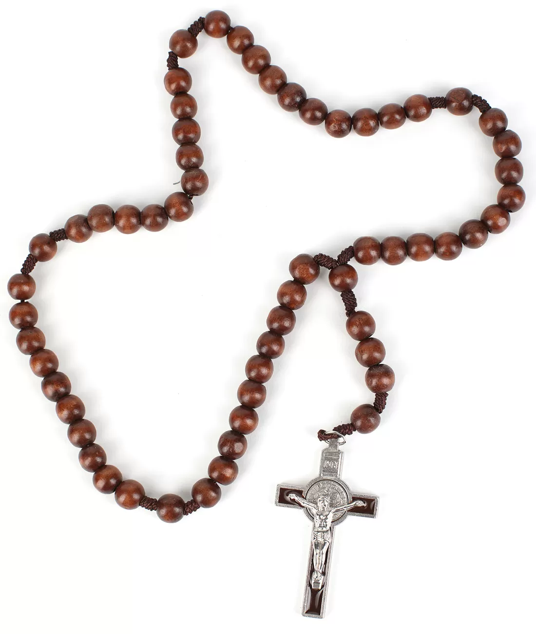 Růženec z tmavého dřeva na šňůrce, s většími korálky o průměru 1 cm a kovovým křížem svatého otce Benedikta o velikosti 7 cm. Crux Sancti Patris Benedicti je kříž s delším svislým ramenem, vepsaný do oválu, nebo kříž rovnoramenný, vepsaný do kruhu. Mezi rameny kříže jsou písmena C S P B: Crux Sancti Patris Benedicti – Kříž svatého otce Benedikta. Na kříži jsou písmena: na svislém břevnu C S S M L: Crux Sancta Sit Mihi Lux – Svatý kříž mi buď světlem, na příčném břevnu N D S M D: Non Draco Si…t Mihi Dux – drak (tj. ďábel) ať mi není vůdcem. Na oválu (nebo kruhu) kolem kříže jsou písmena V R S N S M V S M Q L I V B: Vade Retro Satana Numquam Suade Mihi Vana Sunt Mala Quæ Libas Ipse Venena Bibas Odstup dále Satane a nikdy mi neraď. Marné je zlo, které nabízíš, ten jed si vypij sám.