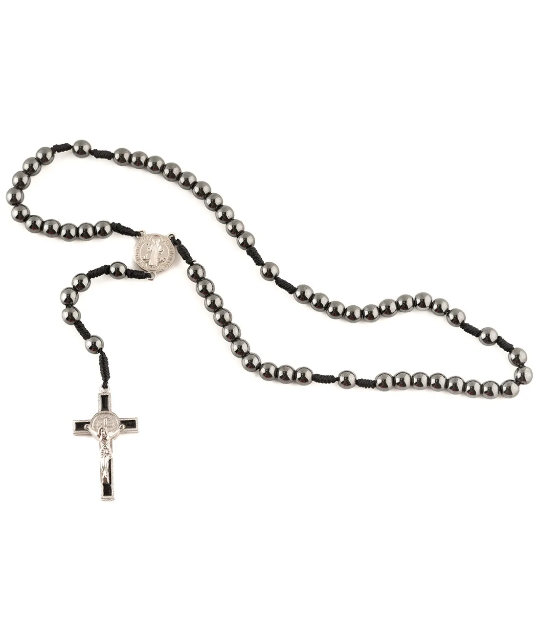 Růženec z hematitu s mini korálky, kovovou medailkou sv. Benedikta a křížkem sv. Benedikta o výšce 3,5 cm