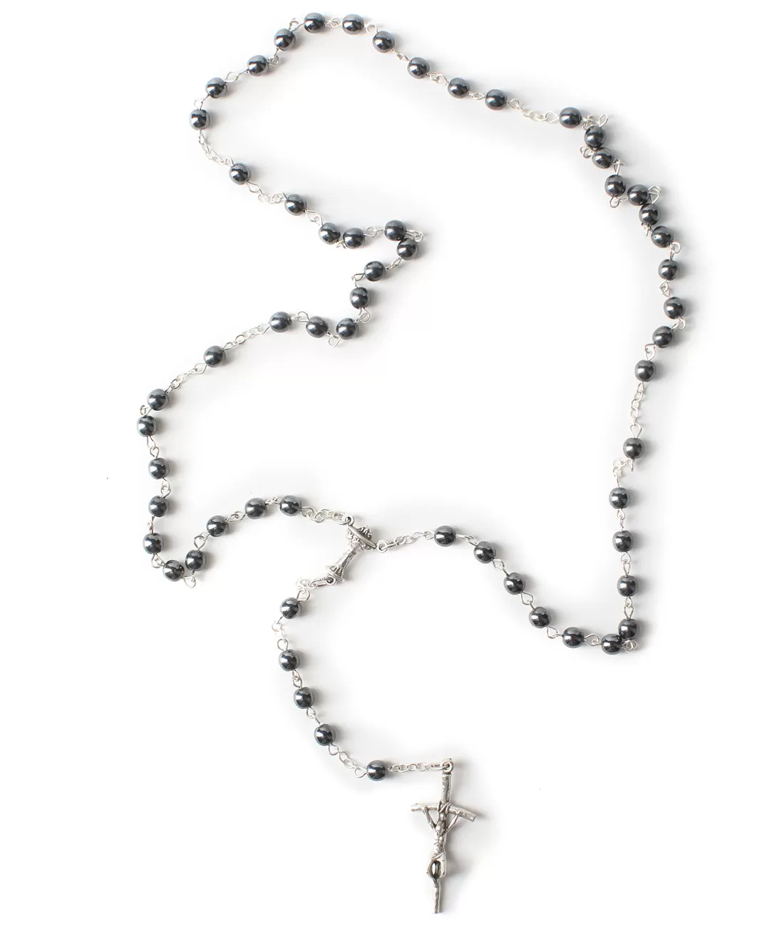 Růženec s Pannou Marií a stříbrným křížkem, vyrobený z hematitu. V dobách středověku se hematitové kameny brousily do podobizen panovníků či svatých a vkládali se do šperků či pečetí. Hematit může být stříbřitě-šedý s kovovým leskem, ocelově tmavý i světlý nebo červenohnědý. Právě podle červenohnědého odstínu dostal tento drahý kámen své jméno a to z řeckého slova Haema neboli krev. Ve středověku totiž věřili, že hematit vznikl tak, že se po bitvě vsákla do země krev padlých bojovníků.