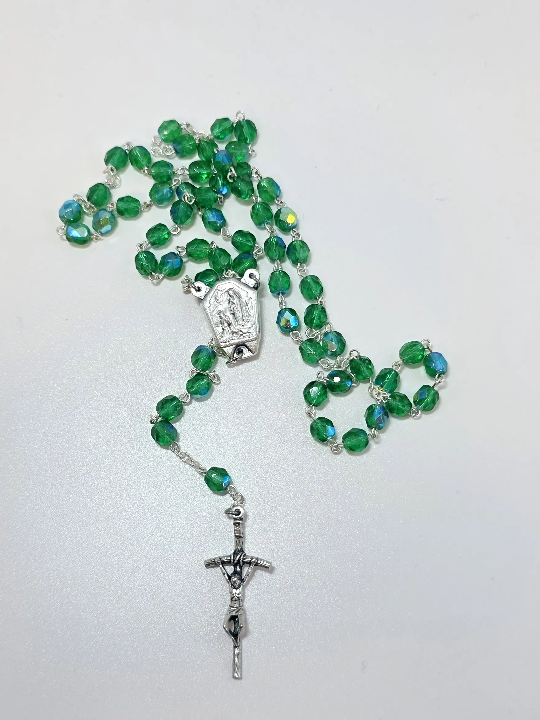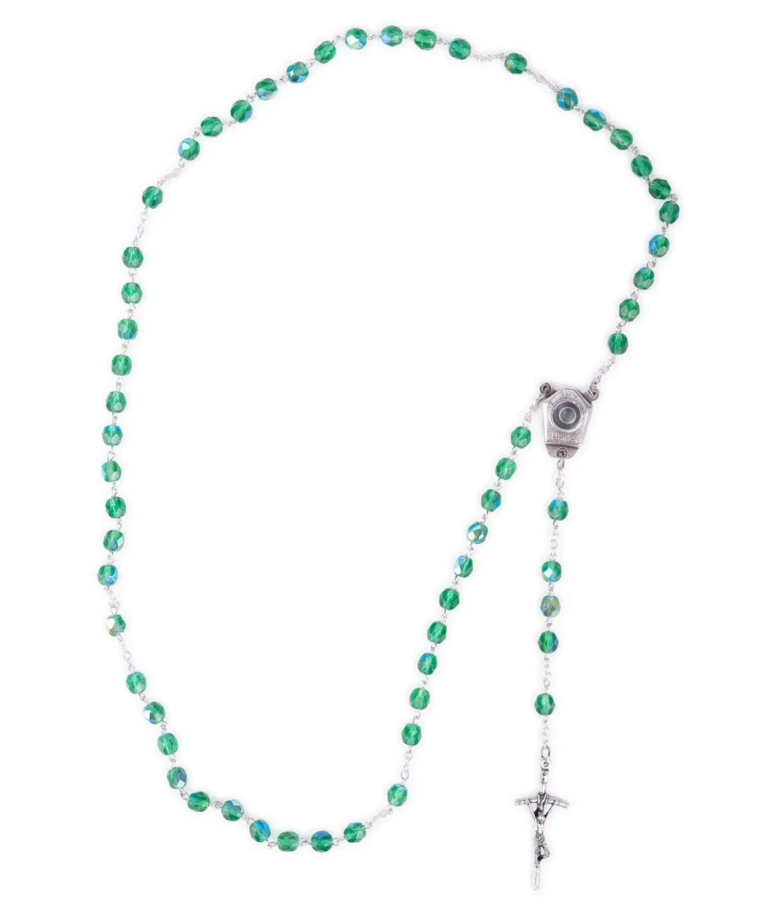 Růženec s kovově světle zelenými korálky, s medailkou obsahující vodu z Lurd a s papežským křížkem. Velikost křížku je 4 cm.