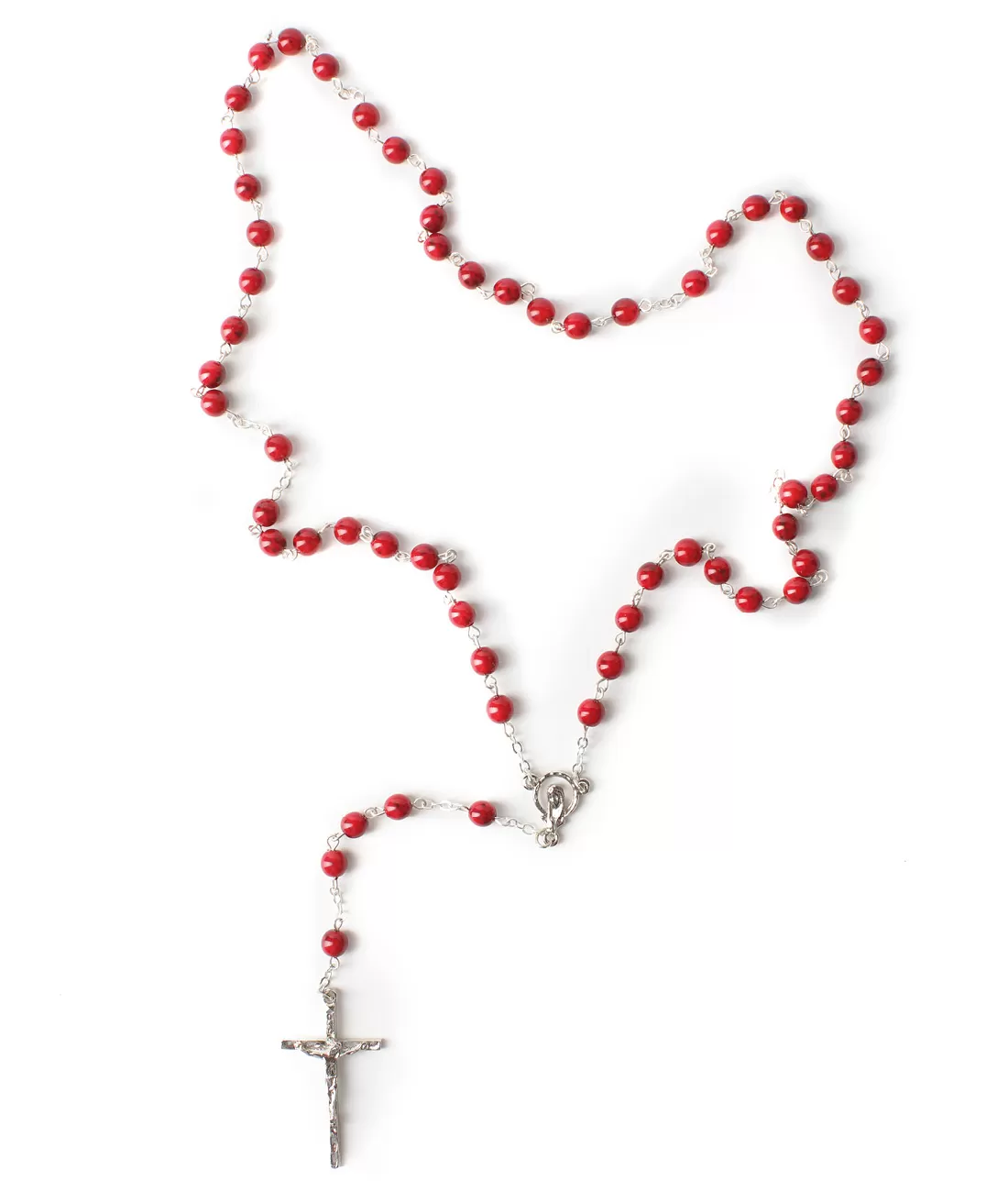 Růženec z 59 kulatých perlí ve velikosti 6mm a barvě rozmývaný červený vosk s černými znaky.