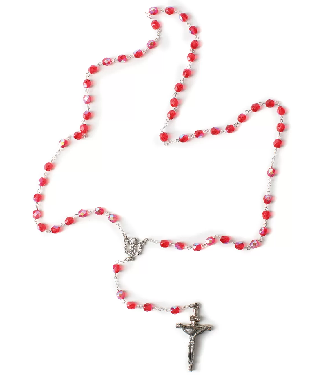 Růženec z 59 ohněm leštěných perlí ve velikosti 6mm a barvě rubín.