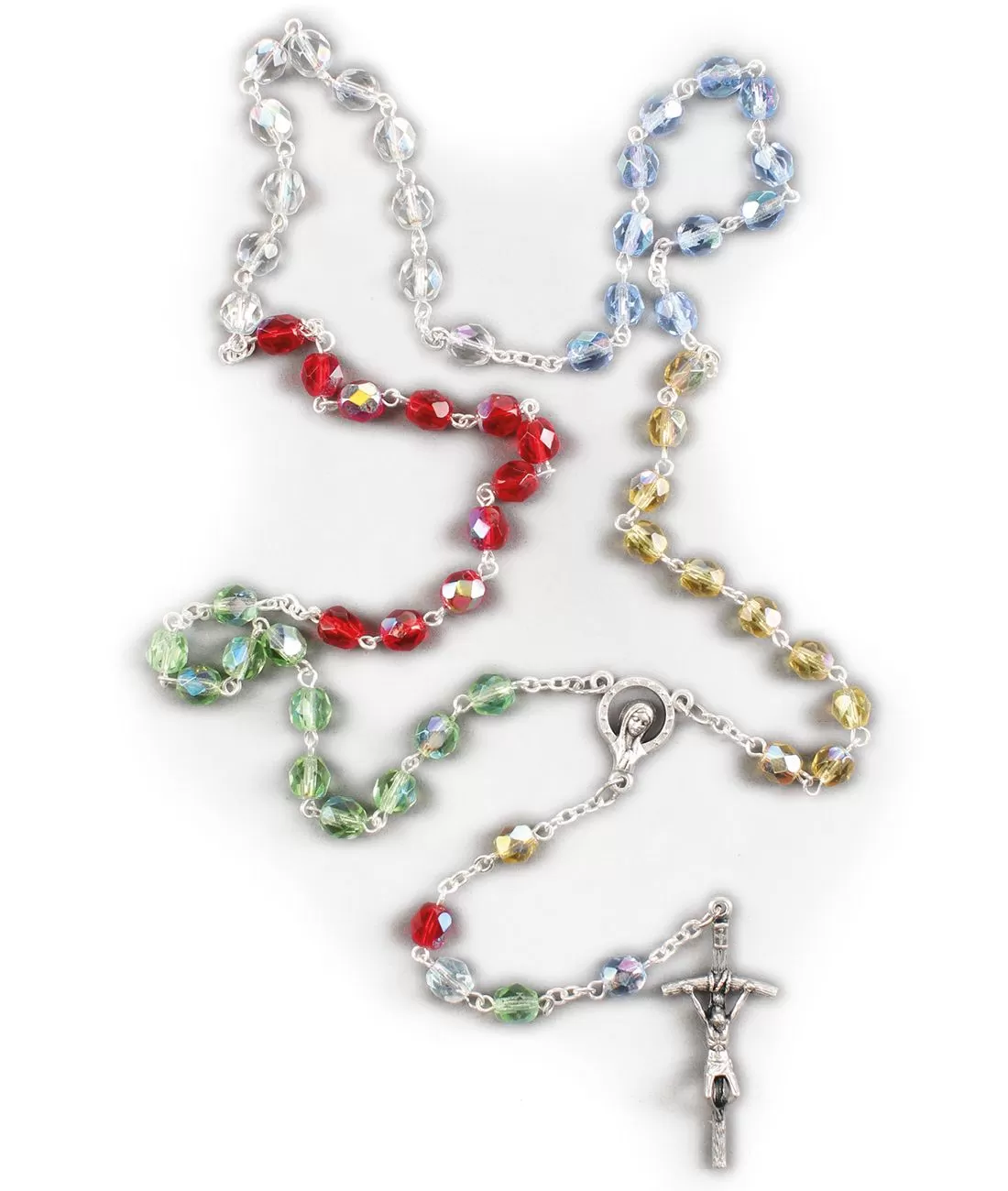 Misijní růženec s bílými perlami a stříbrným křížkem.