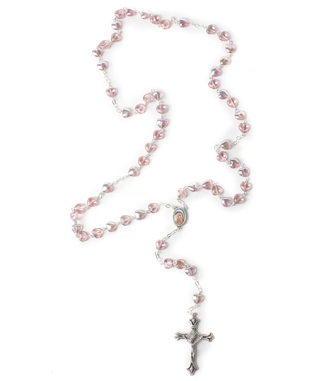 Růženec z 59 mačkaných perlí ve tvaru srdce 8 x 8 mm a barvě ametyst.