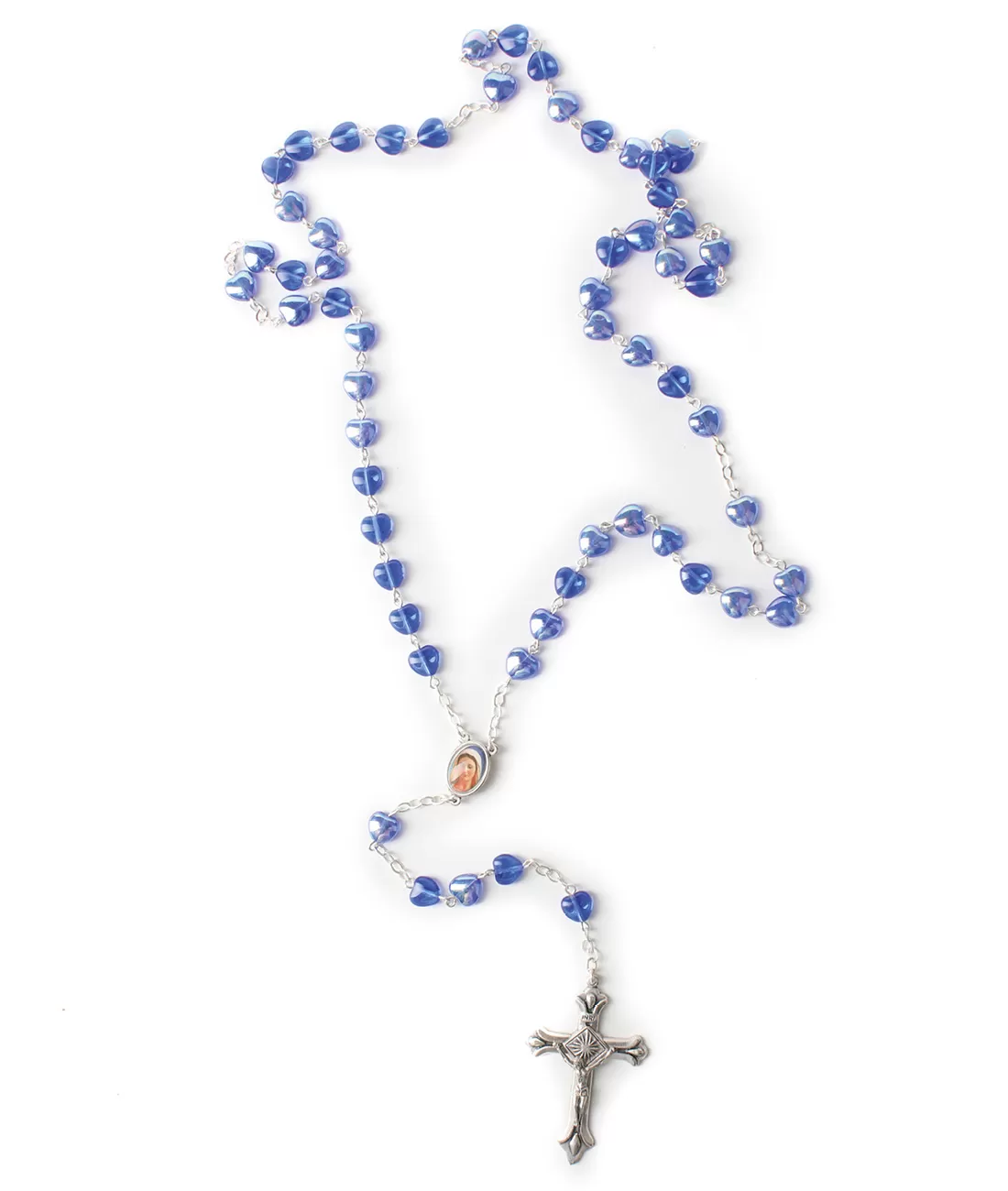 Růženec z 59 mačkaných perlí ve tvaru srdce velikosti 8 x 8 mm a barvě safír.
