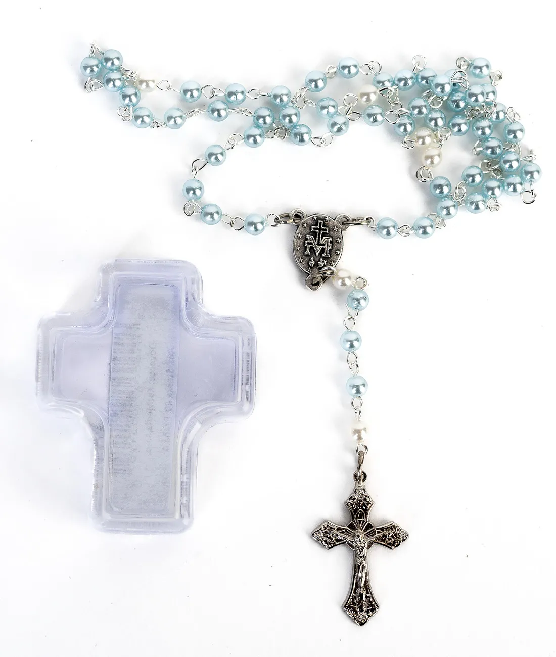 Růženec s drobnými modrými perličkami pro děti, v dárkové krabičce ve tvaru kříže.