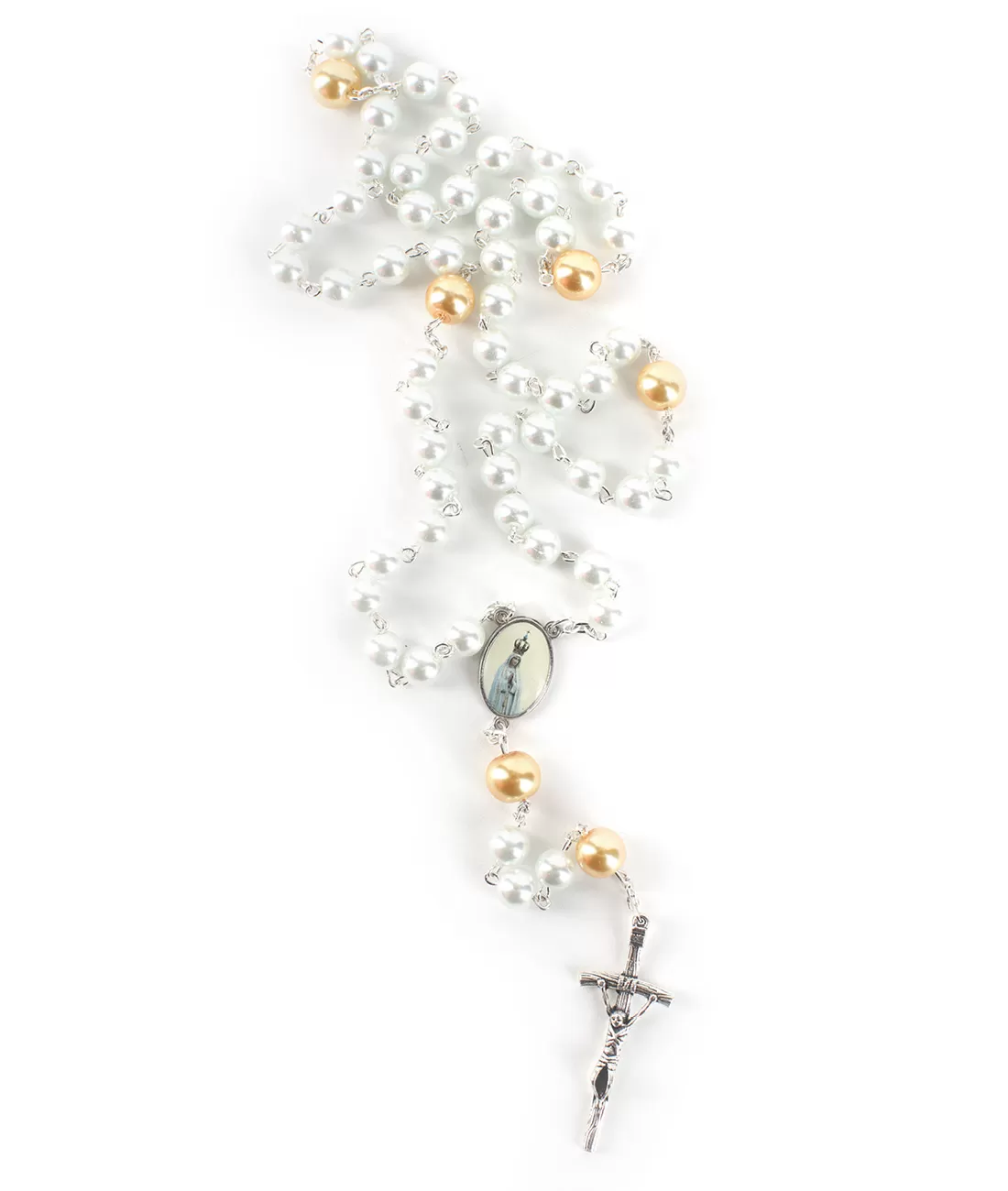 Nádherný jemný růženec s bílými perlami a stříbrným křížkem v dárkové krabičce s motivem Panny Marie Fatimské.