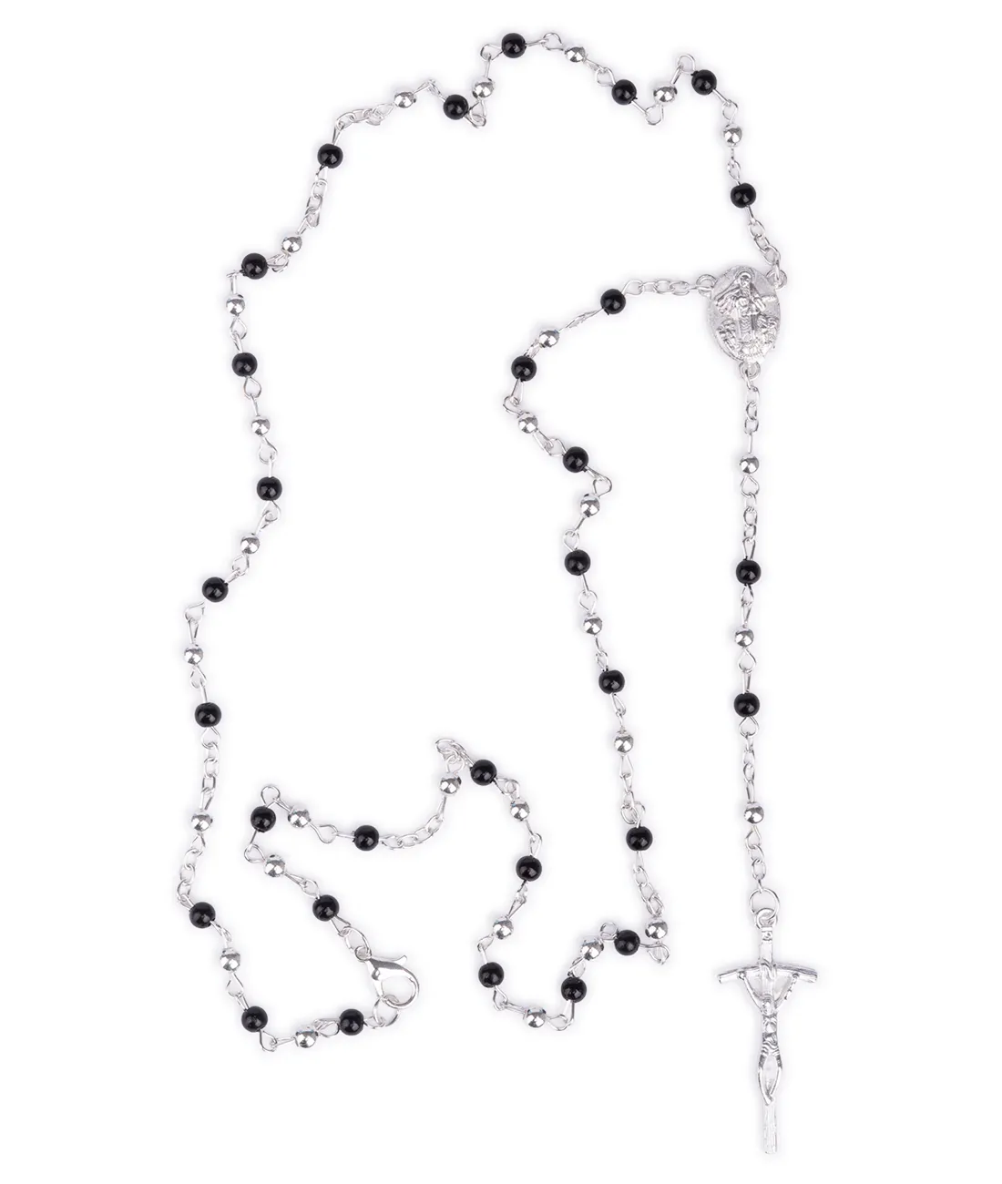 Růženec v lahvičce s medailkou Panny Marie Medžugorské v dárkové lahvičce s korálky v černé a stříbrné barvě.